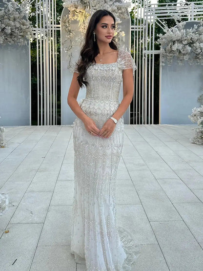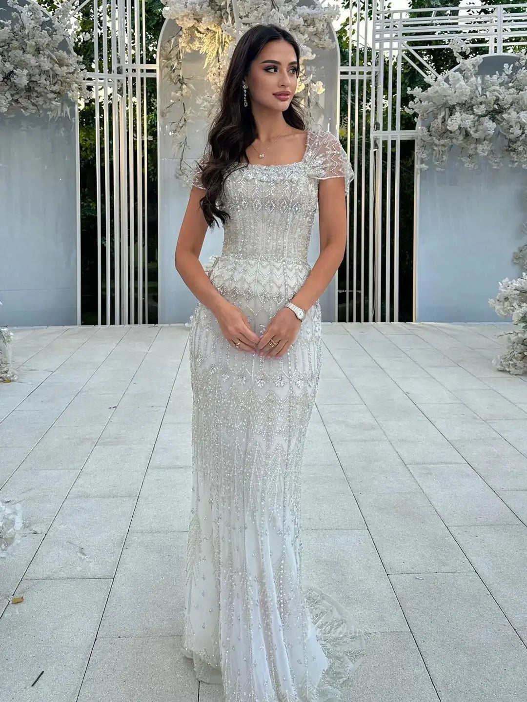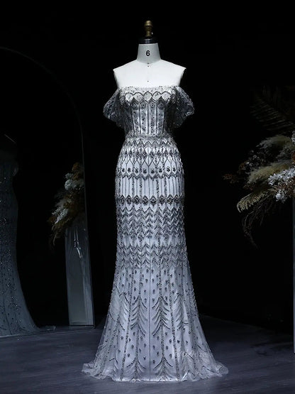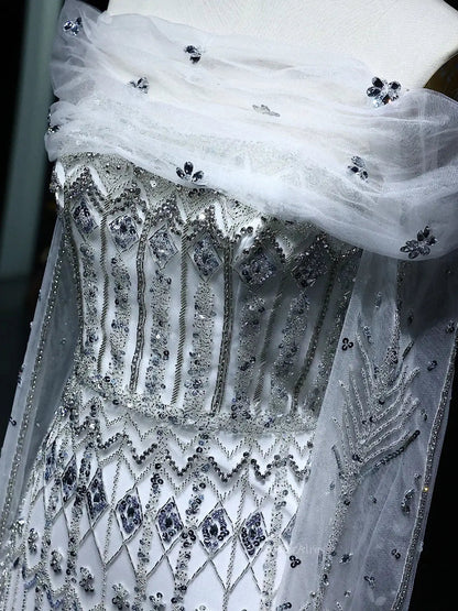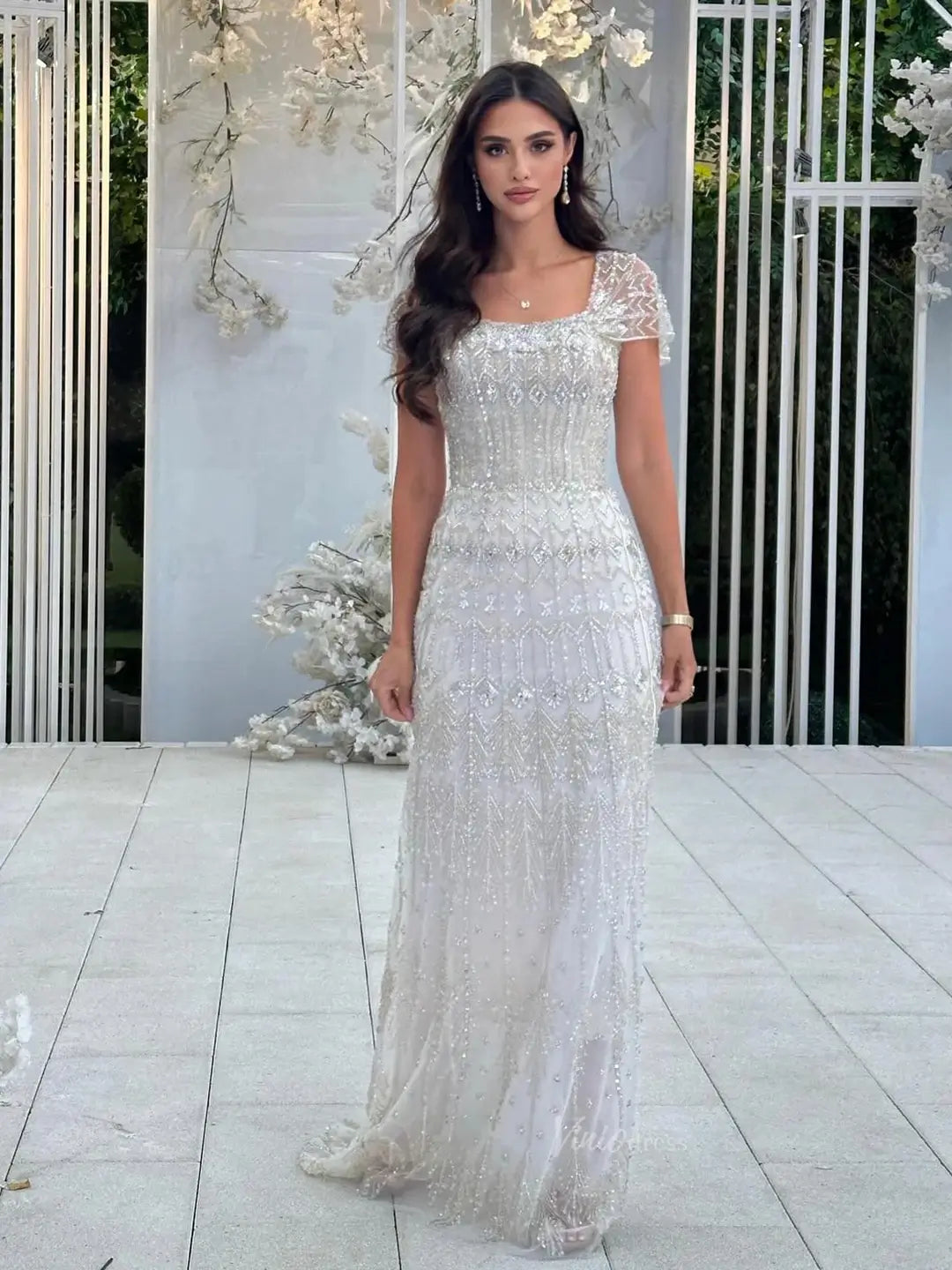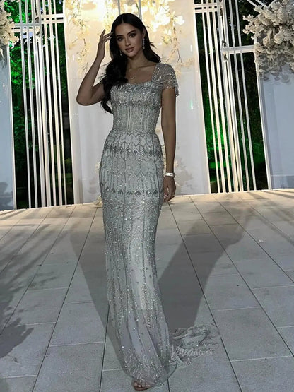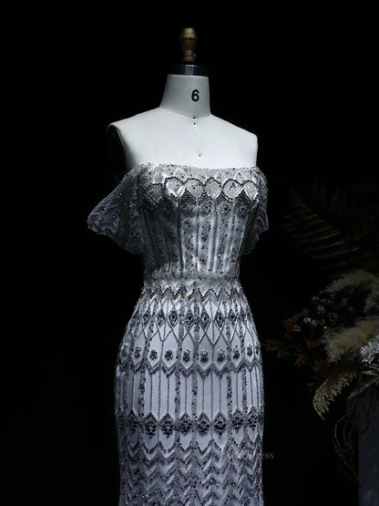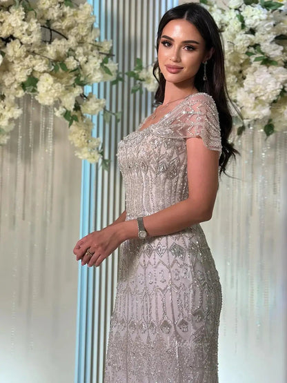 Introducing the Beaded Silver Prom Dresses! This stunning formal dress features intricate vintage beading for a touch of elegance. With two versions of sleeve types available, this dress can be worn for any occasion and is sure to make you stand out. Add this timeless piece to your wardrobe today!
