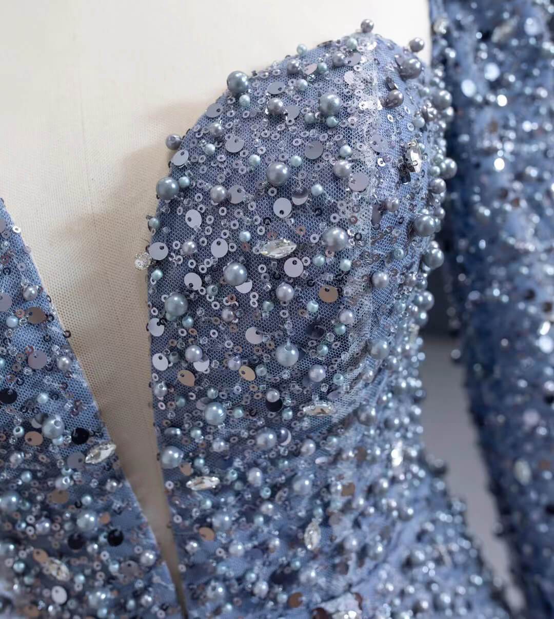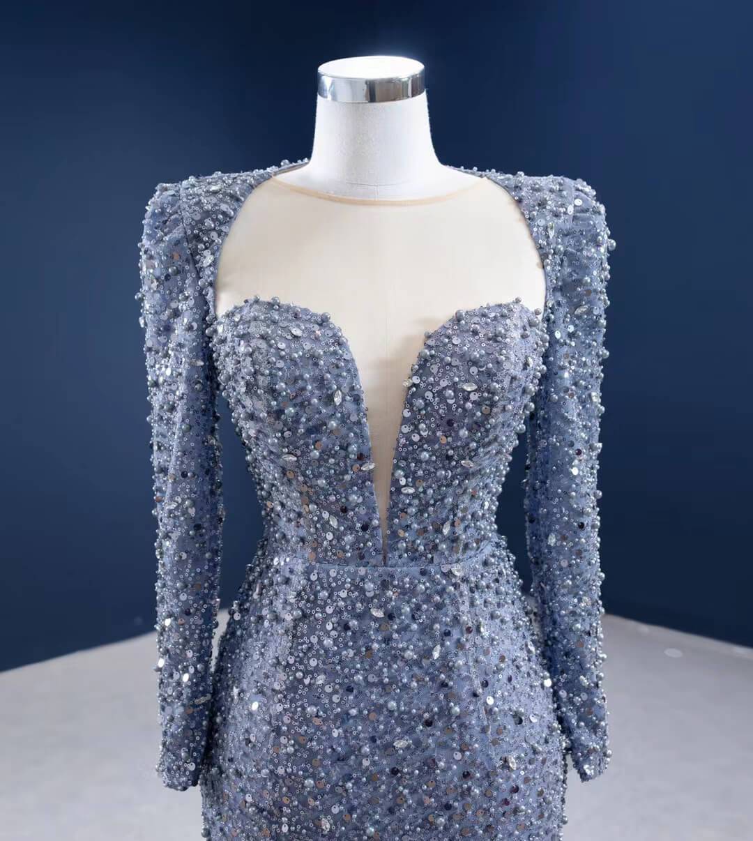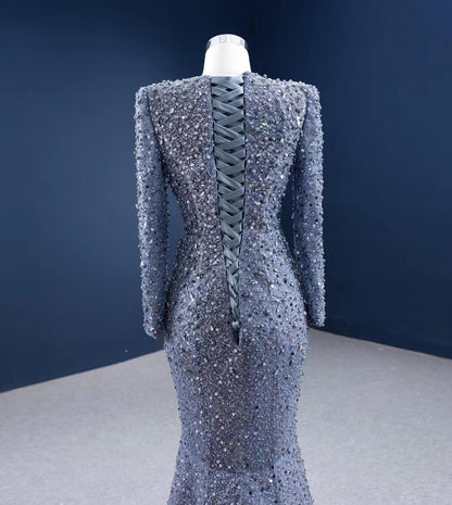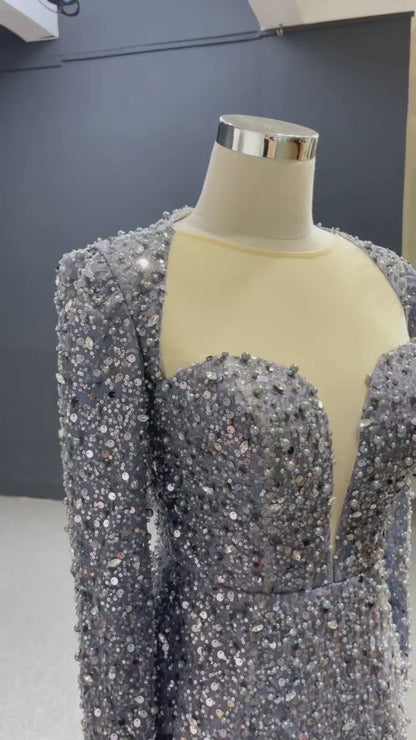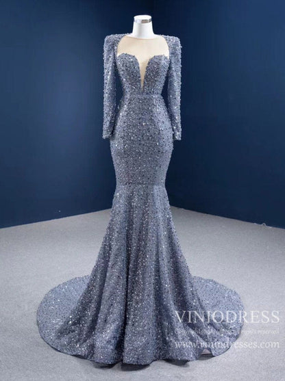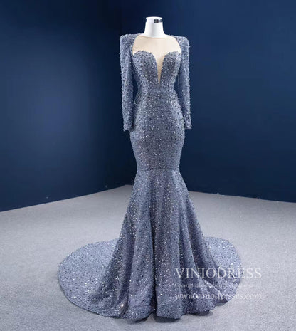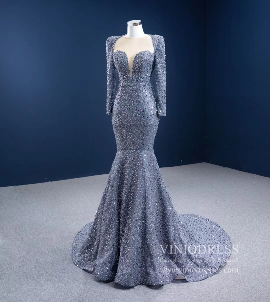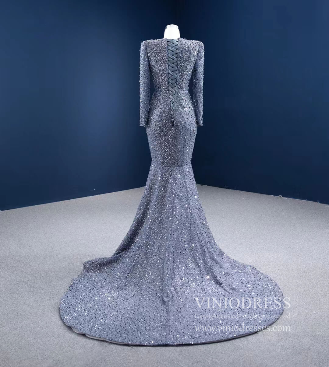 Long Sleeve Gray Mermaid Beaded Prom Dresses with Court Train FD2597 viniodress