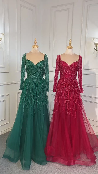 Long Sleeve Green Feather Prom Dresses Beaded Blue Evening Gowns 20004