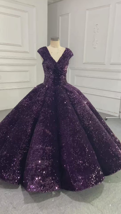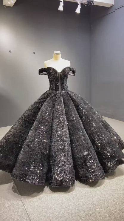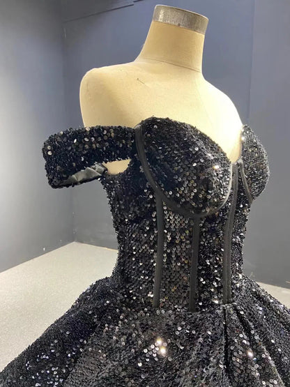 Get ready to shine on your special day with our Sparkly Black Sequin Ball Gown Wedding Dress! Featuring a stunning sequin design, this dress is perfect for any bride or sweet sixteen celebration. With its luxurious ball gown silhouette, you'll be the center of attention. Be bold and make a statement with this elegant gown.