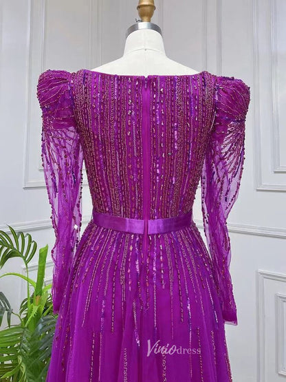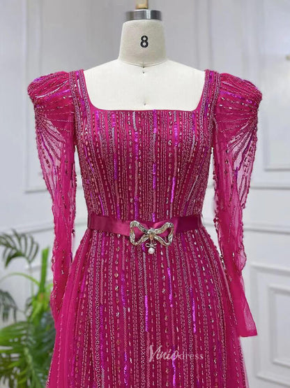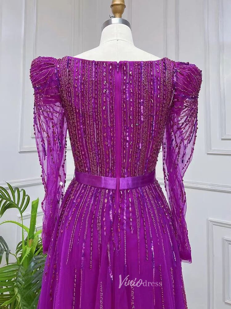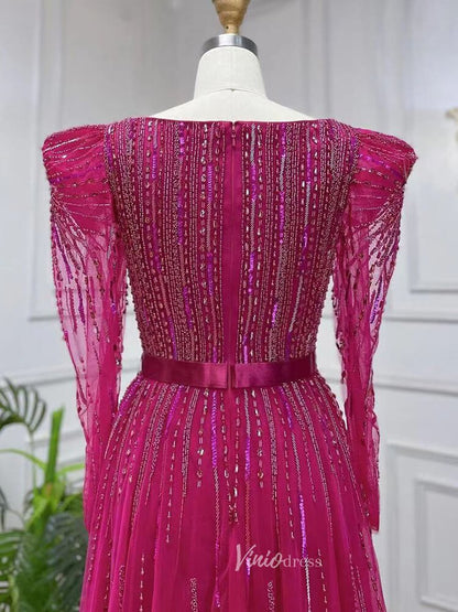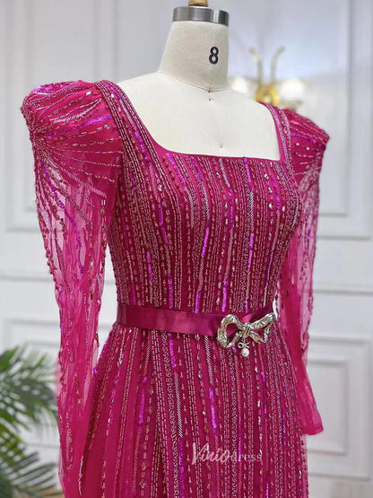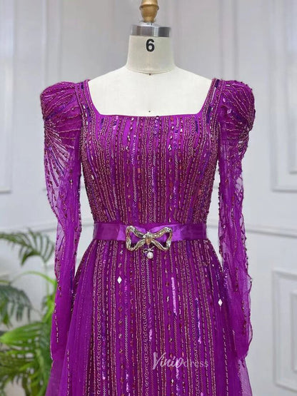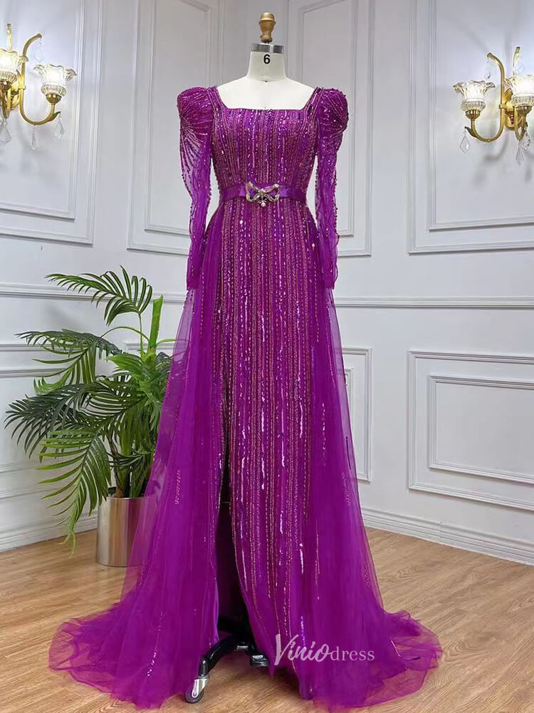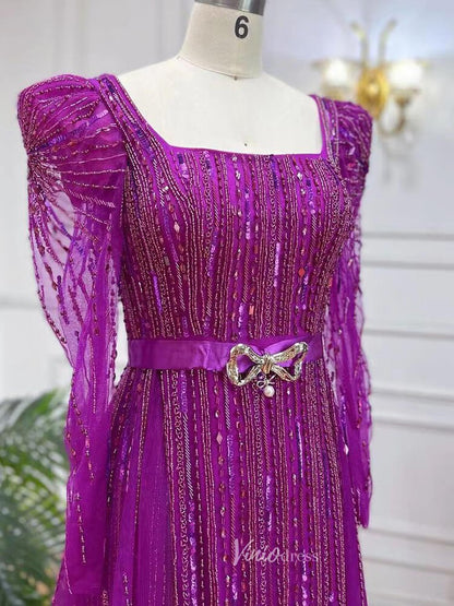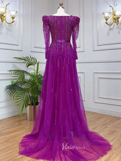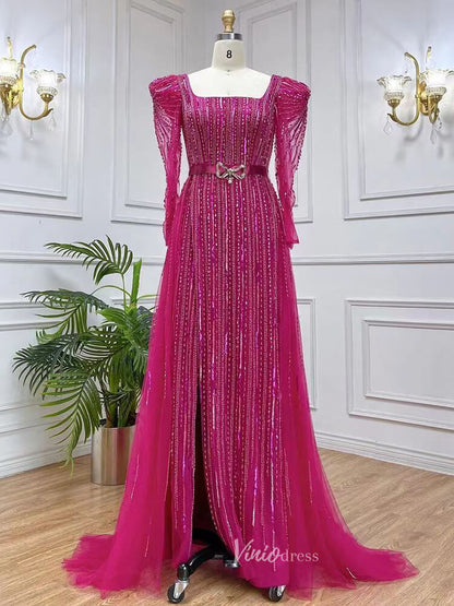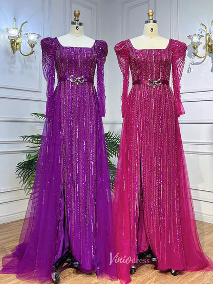 Long Sleeve Magenta Prom Dresses Purple Square Neck Evening Dress with Slit 20048