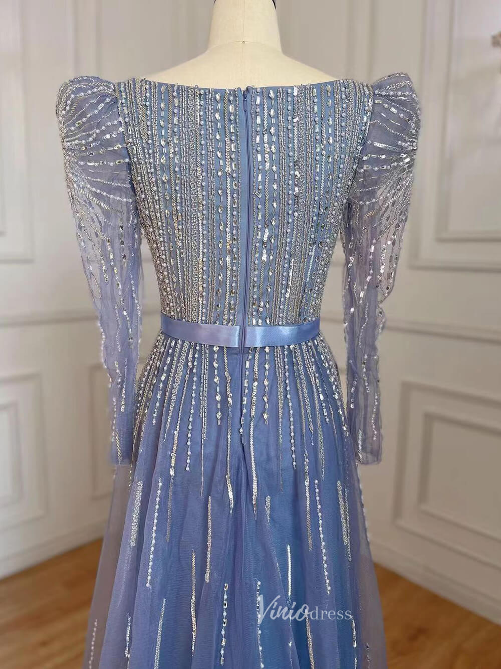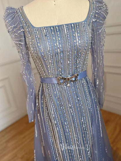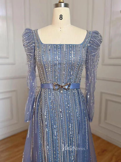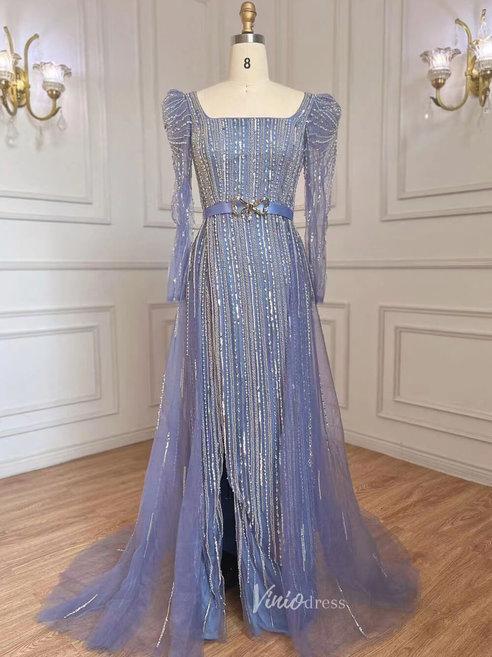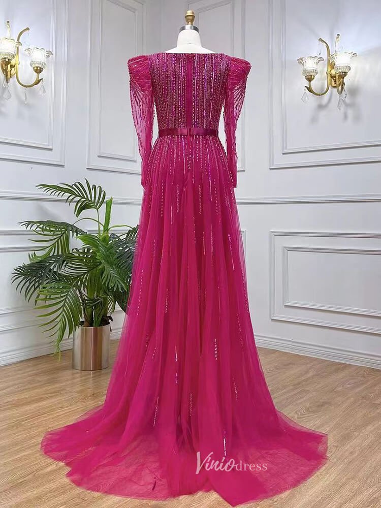 Long Sleeve Magenta Prom Dresses Purple Square Neck Evening Dress with Slit 20048
