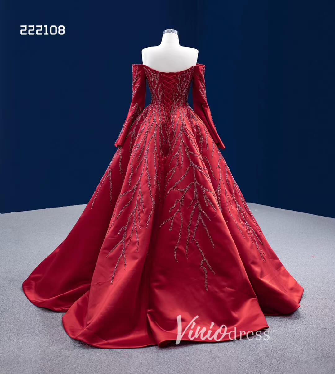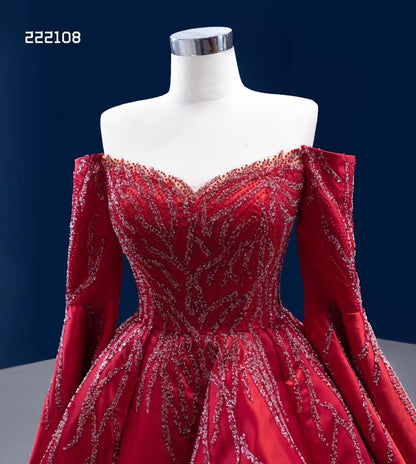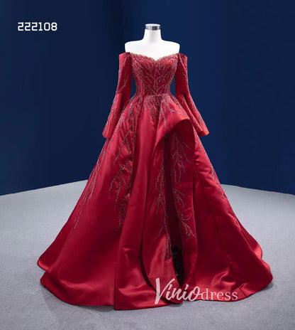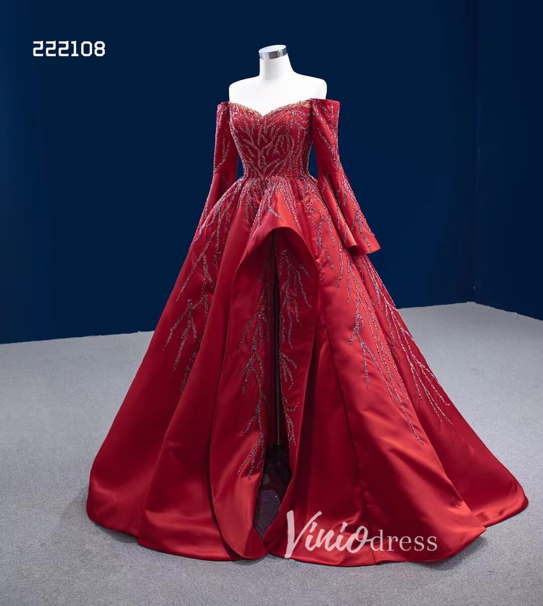 Long Sleeve Red Ball Gown Beaded Satin Wedding Dresses with Slit 222108