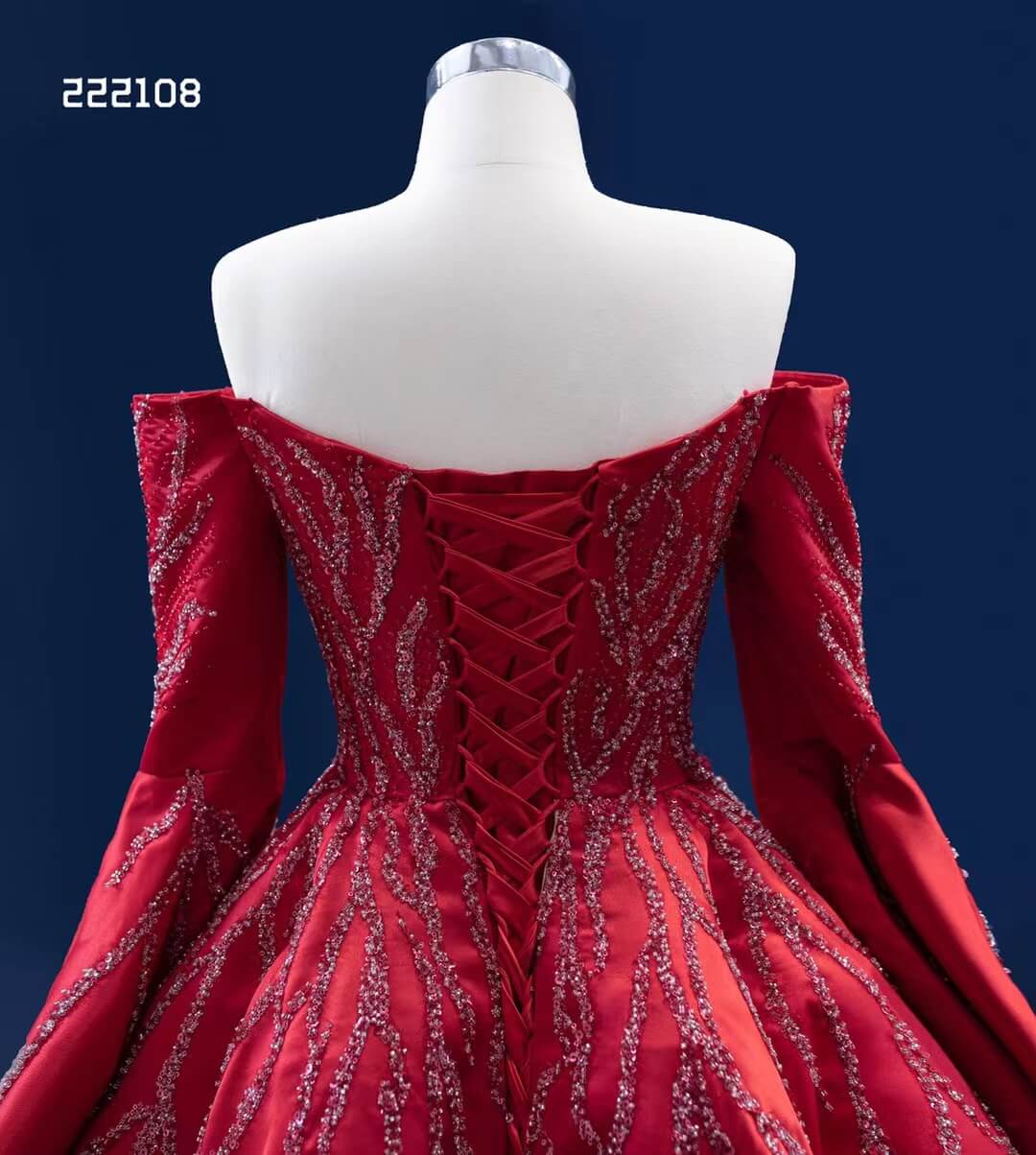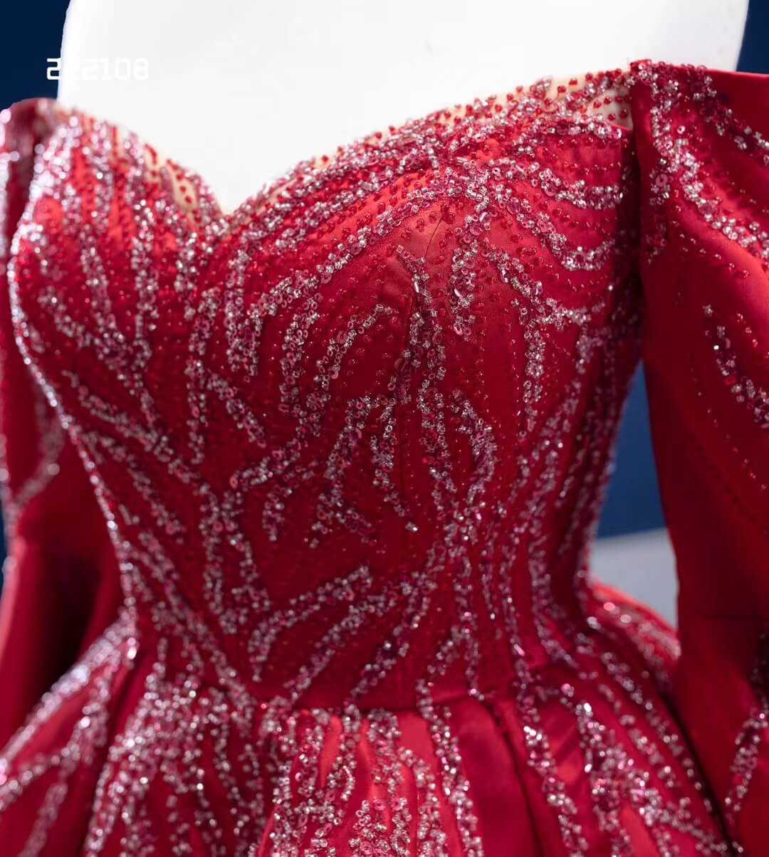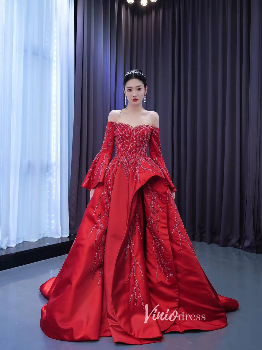 Long Sleeve Red Ball Gown Beaded Satin Wedding Dresses with Slit 222108