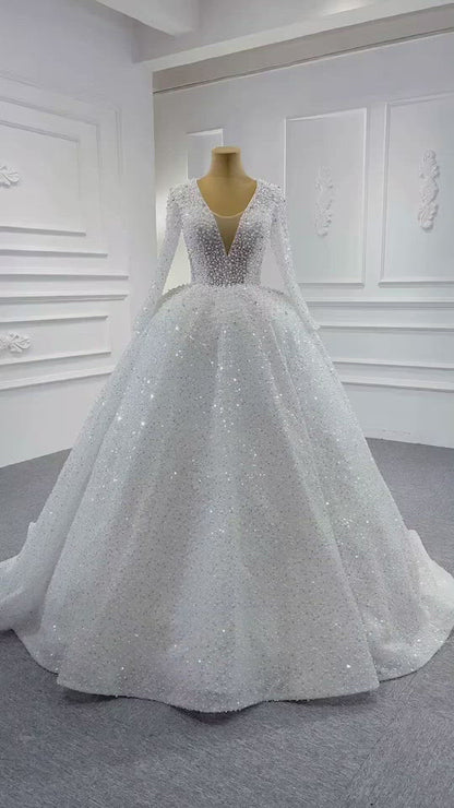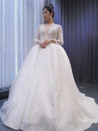 Long Sleeve Pearl Beaded Wedding Dresses Ball Gown V-neck 67265