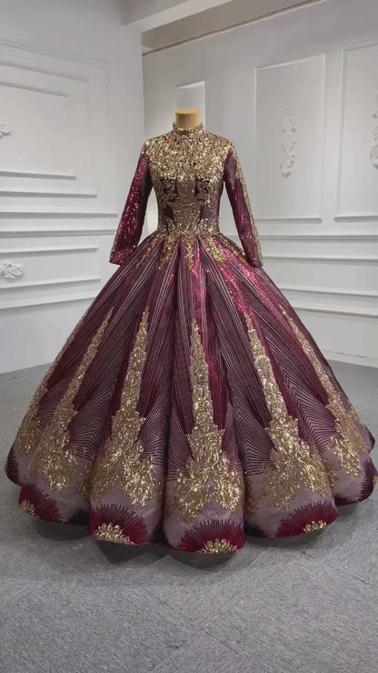 Sparkly Gold Long Sleeve Wedding Dress High Neck 66754 Burgundy