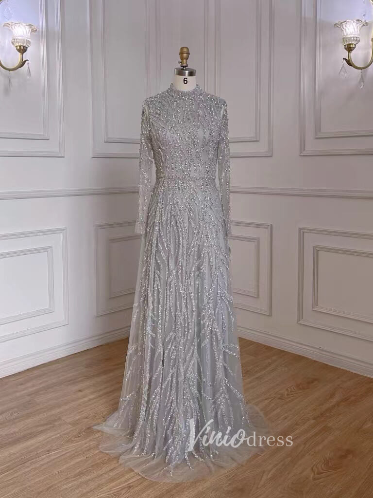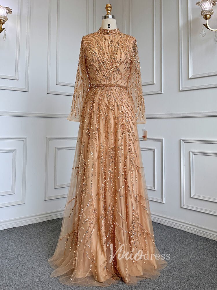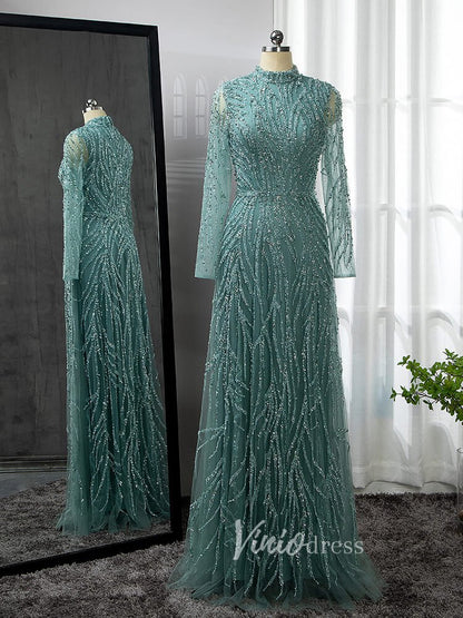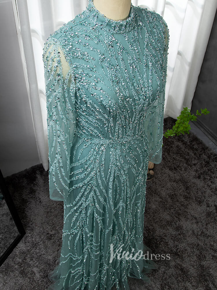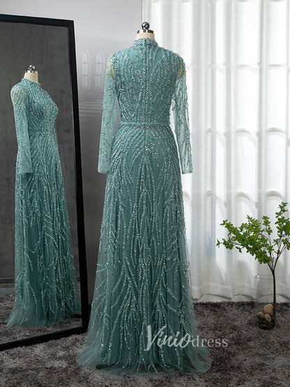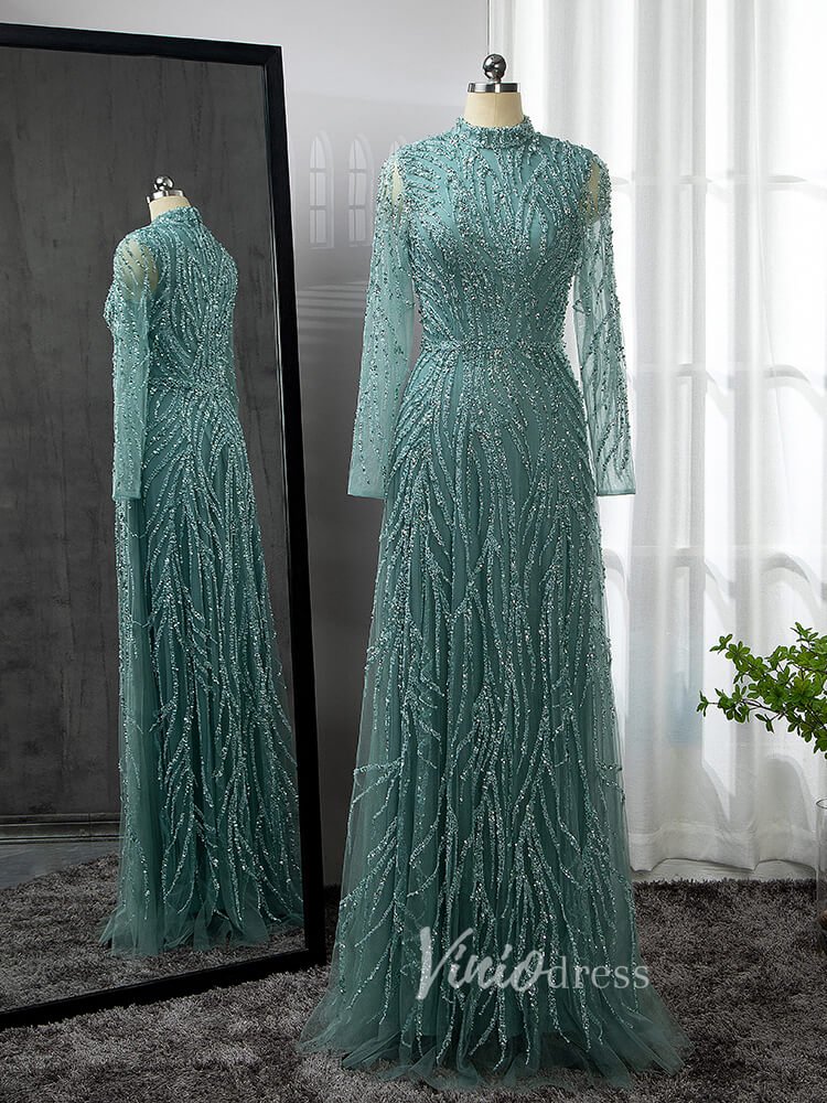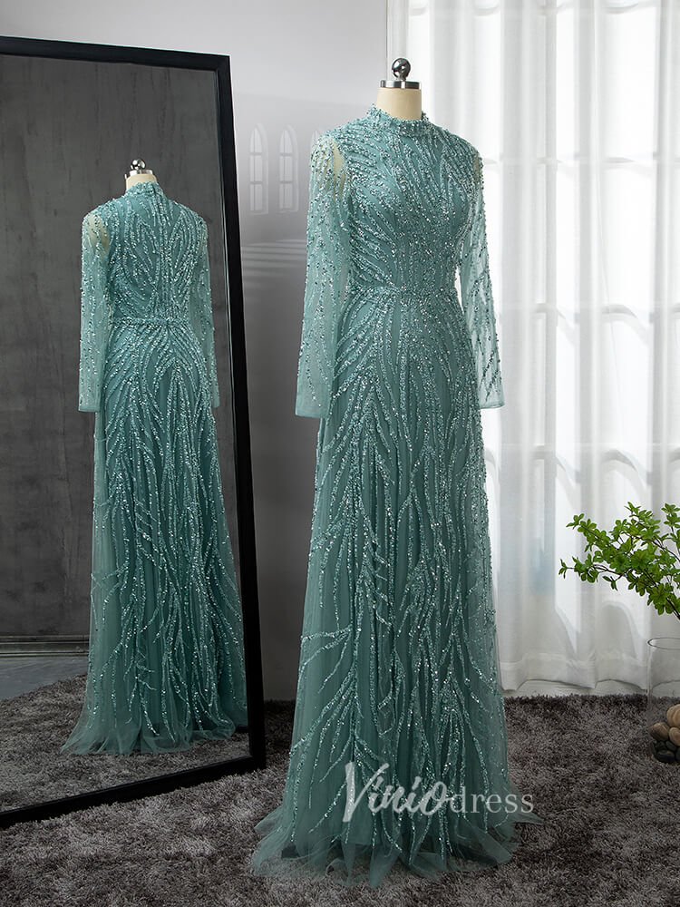 Luxury Beaded Evening Dresses High Neck Long Sleeve Mother of the Bride Dress 20019
