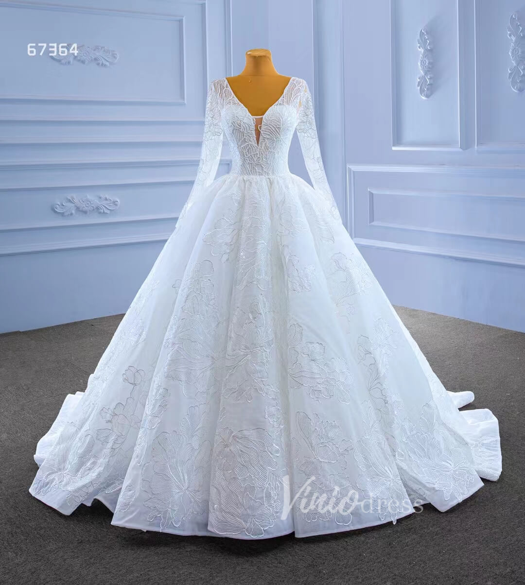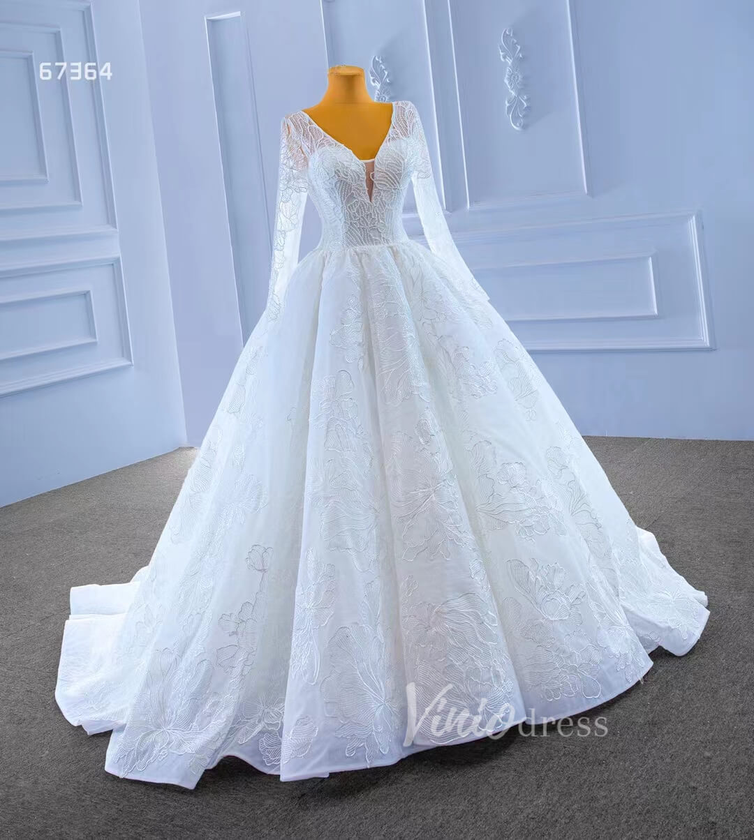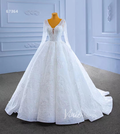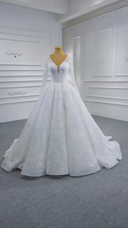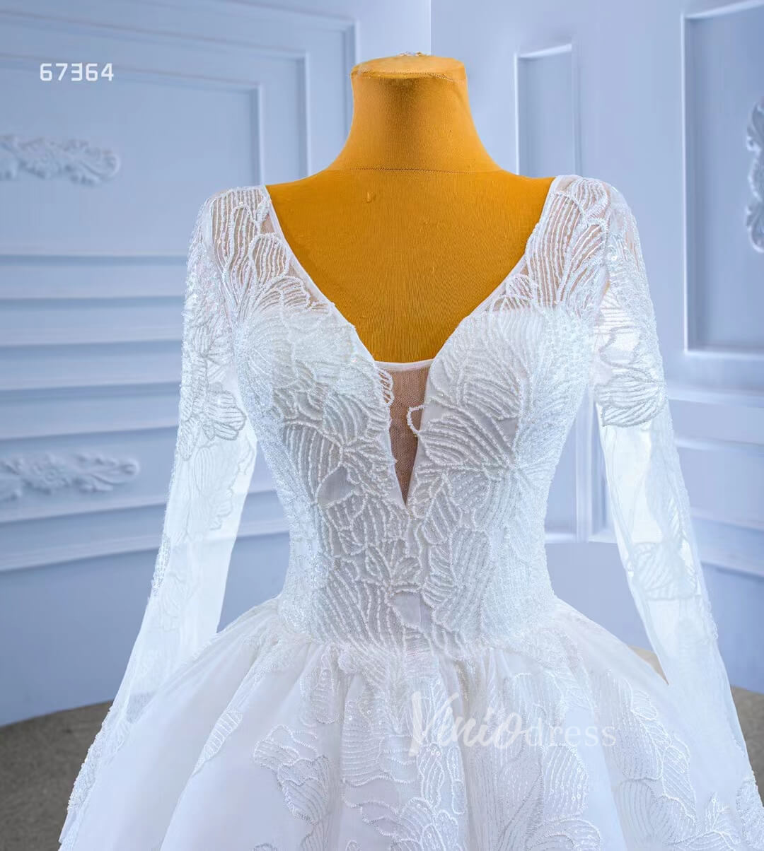 Beaded V-neck Ball Gown Wedding Dress with Sleeves 67364