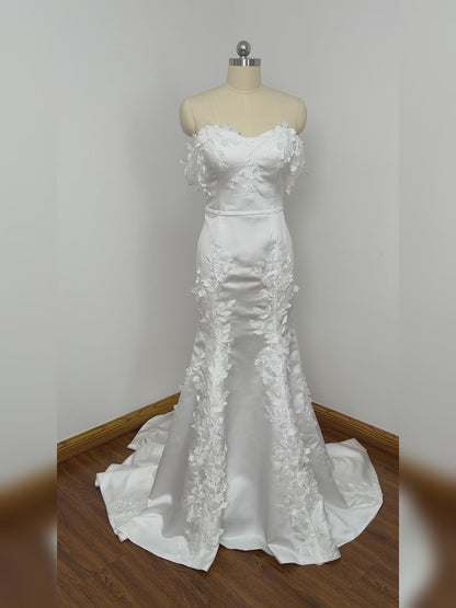 Feel like a magical mermaid in this elegant satin wedding dress! Featuring 3D flower appliques and a modern off-shoulder design, this dress is perfect for the bride who wants to make a statement. Walk down the aisle in style and captivate everyone with this stunning bridal dress.