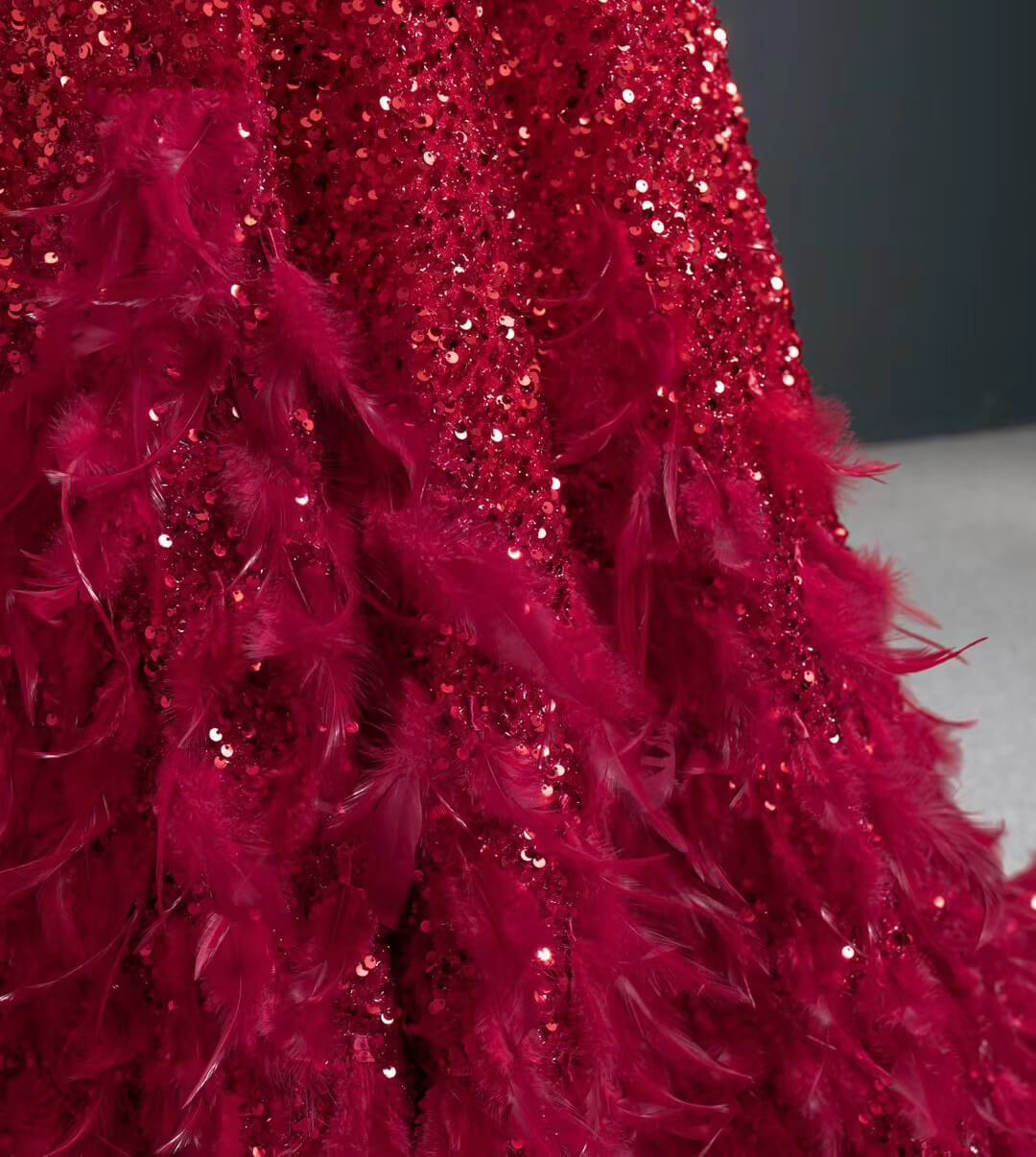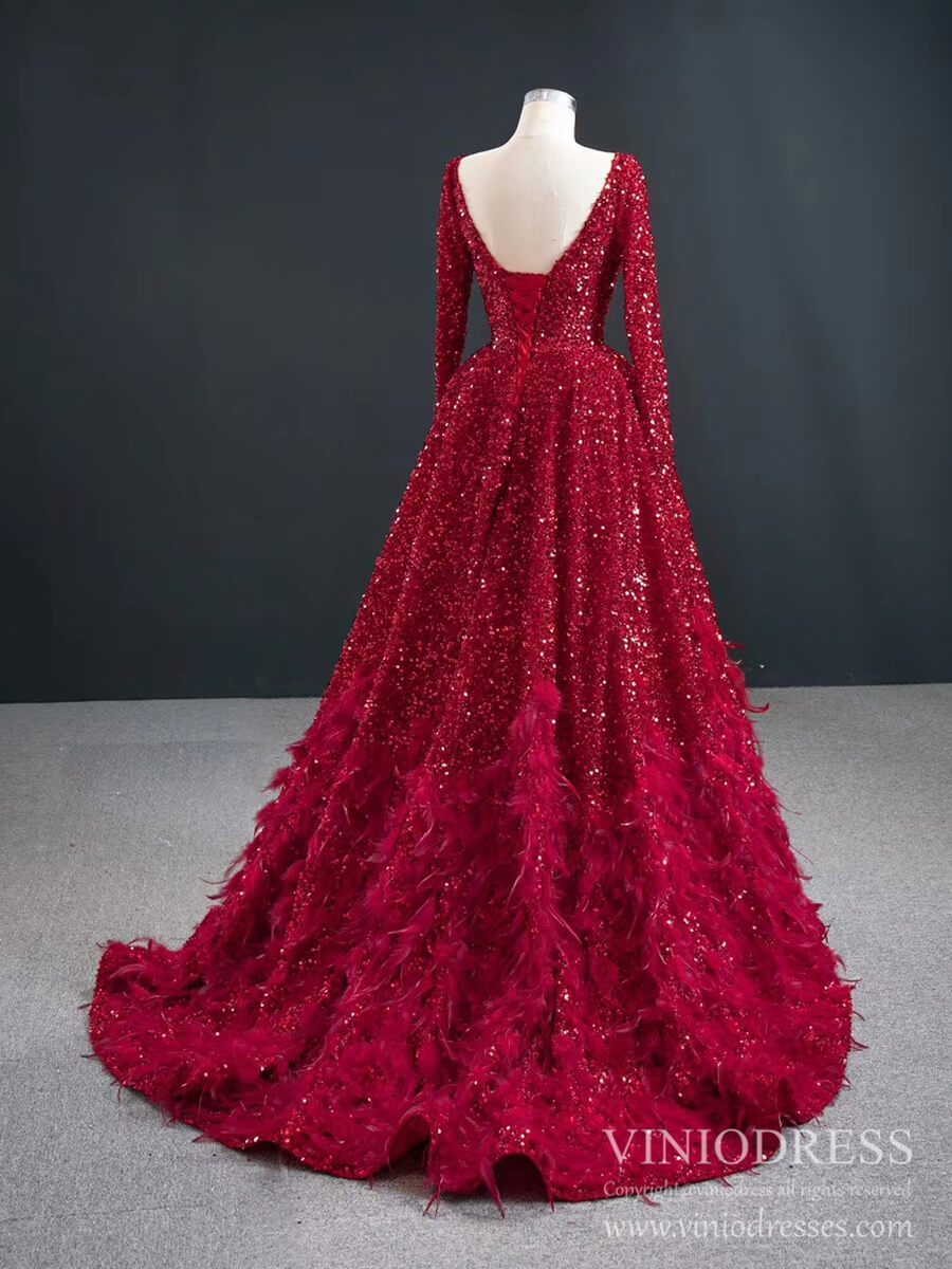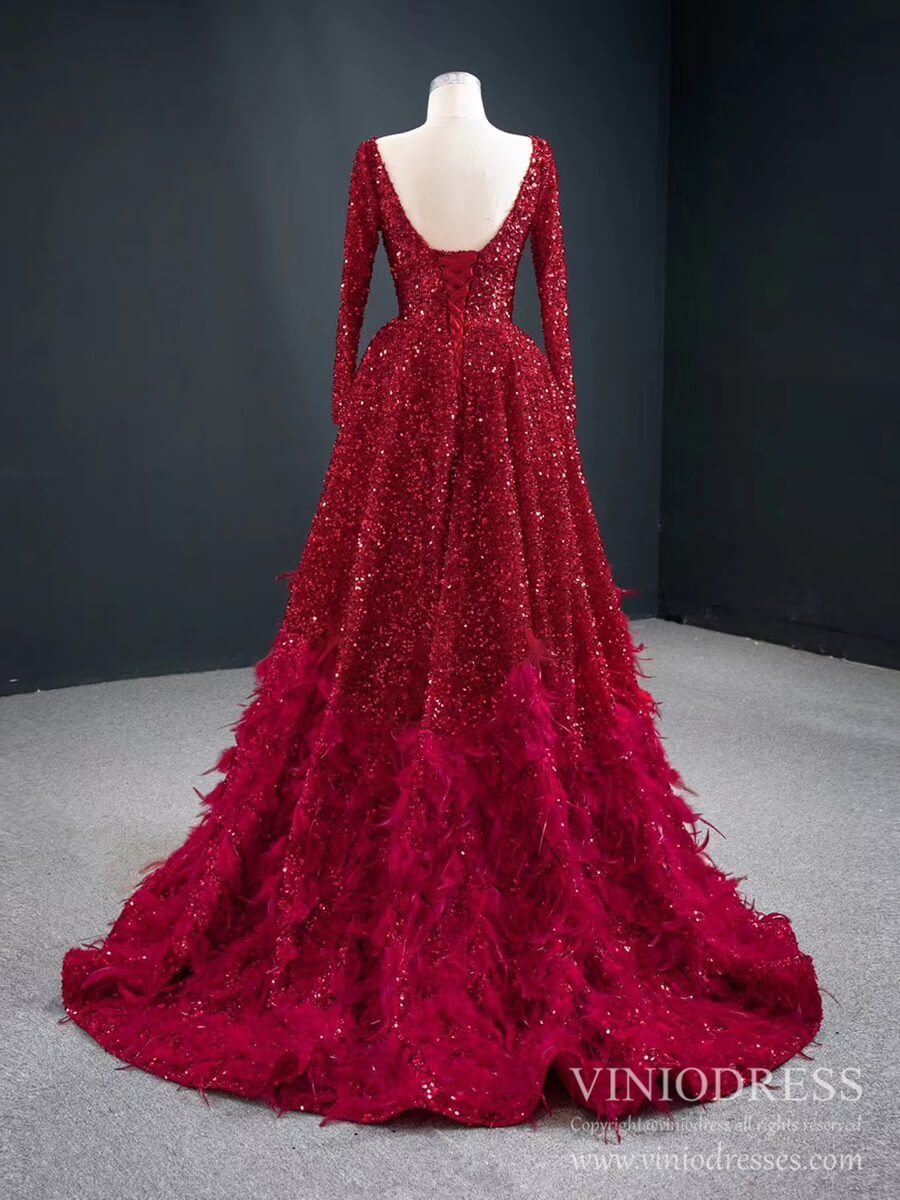 Long Sleeve Red Sequin Prom Dresses Feather Evening Dress 67124