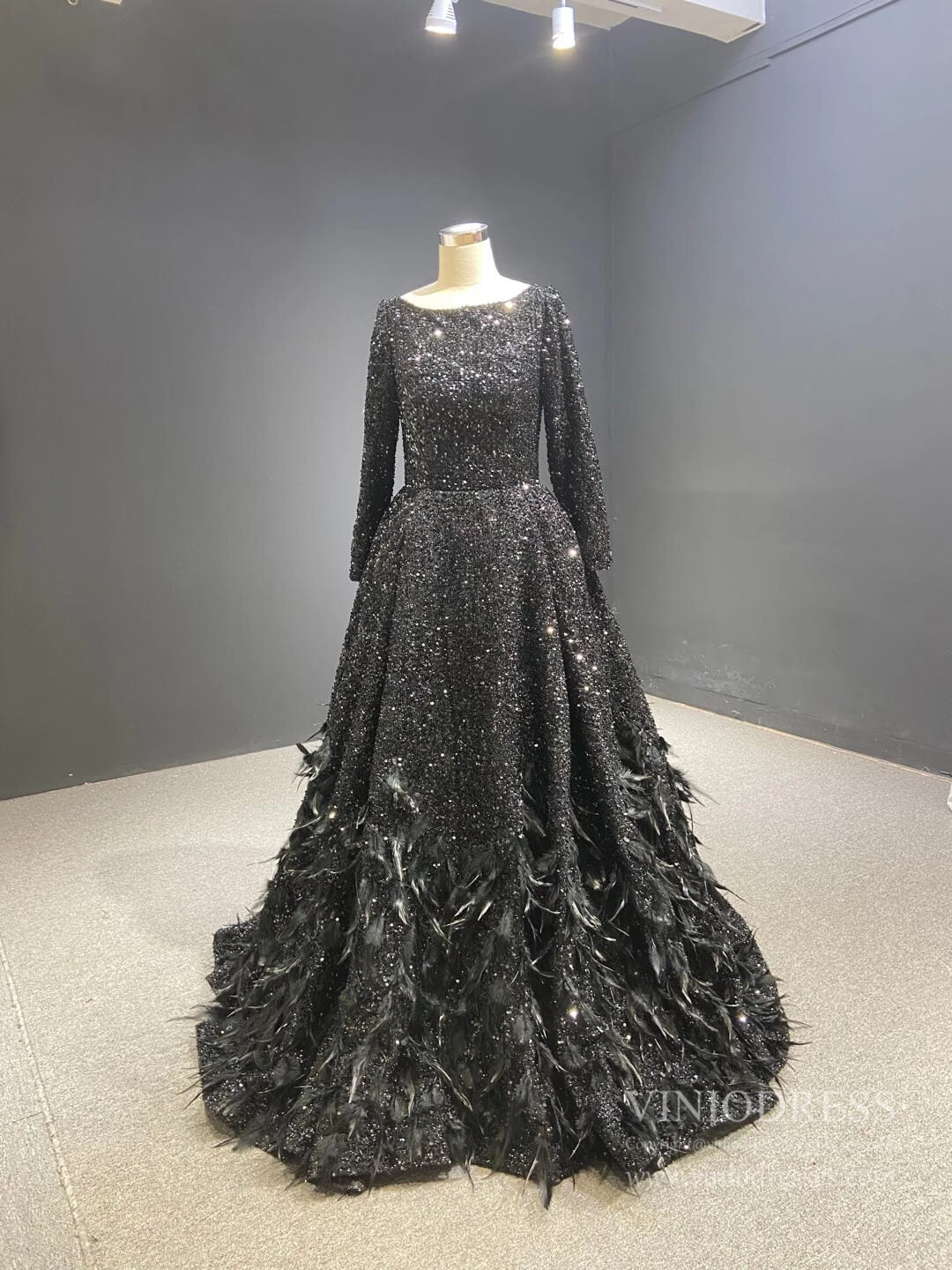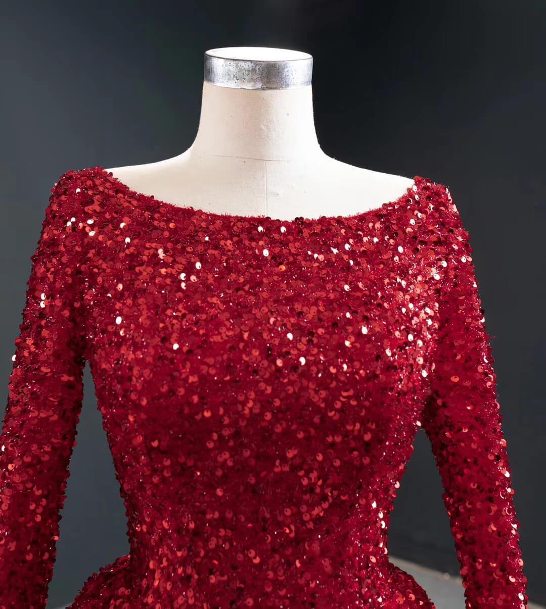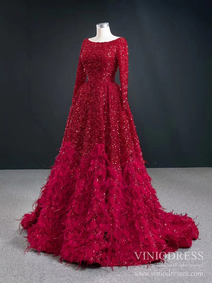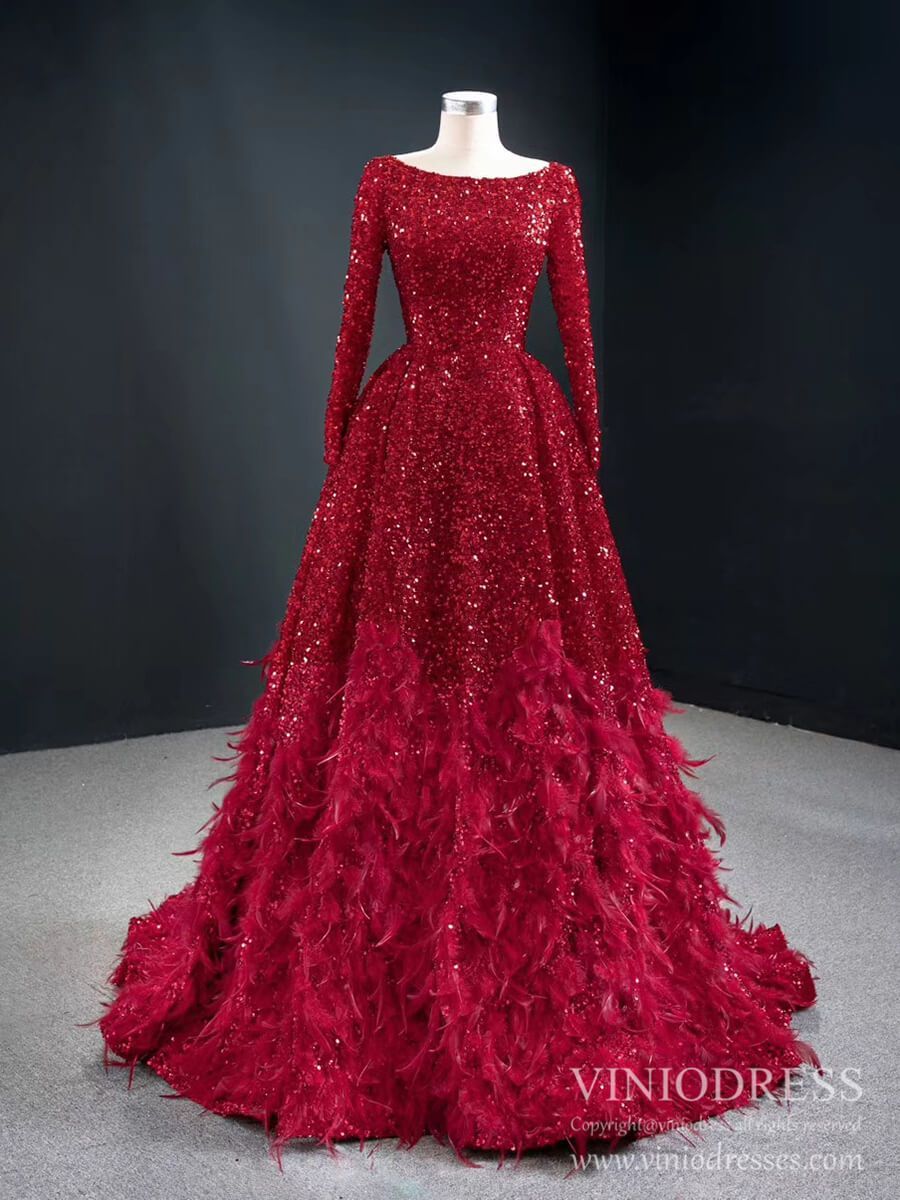Long Sleeve Red Sequin Prom Dresses Feather Evening Dress 67124