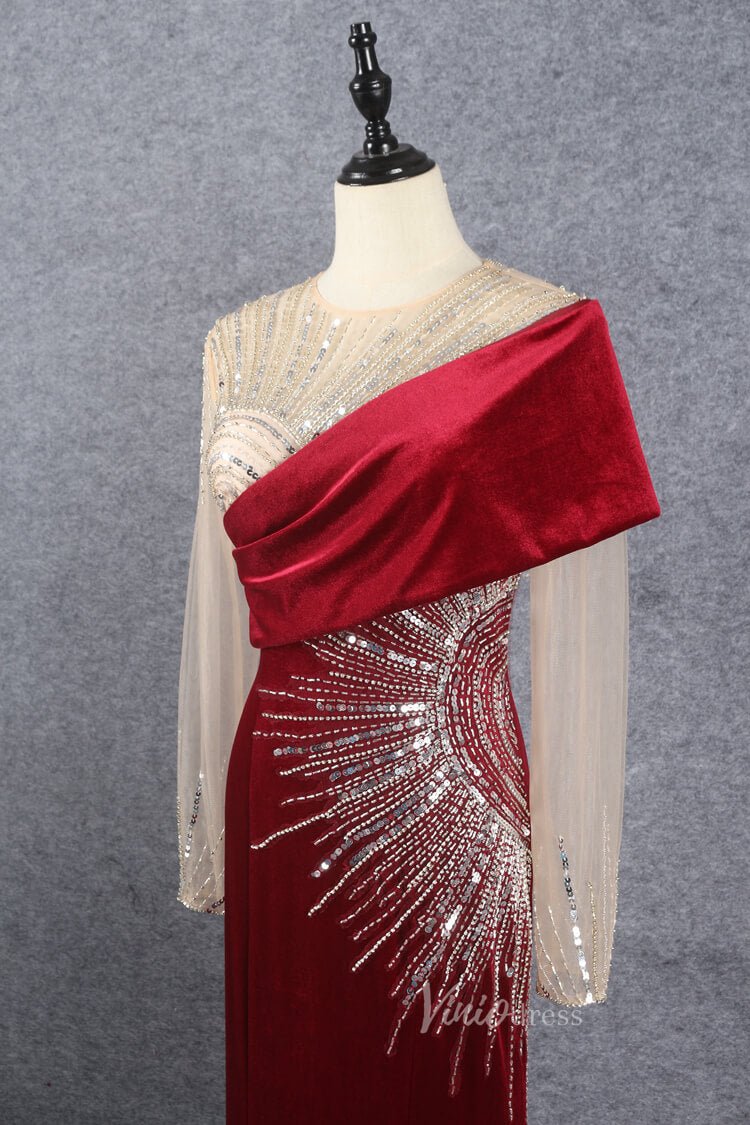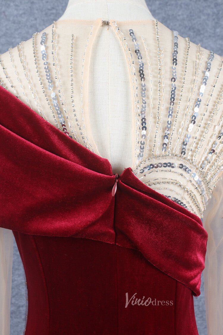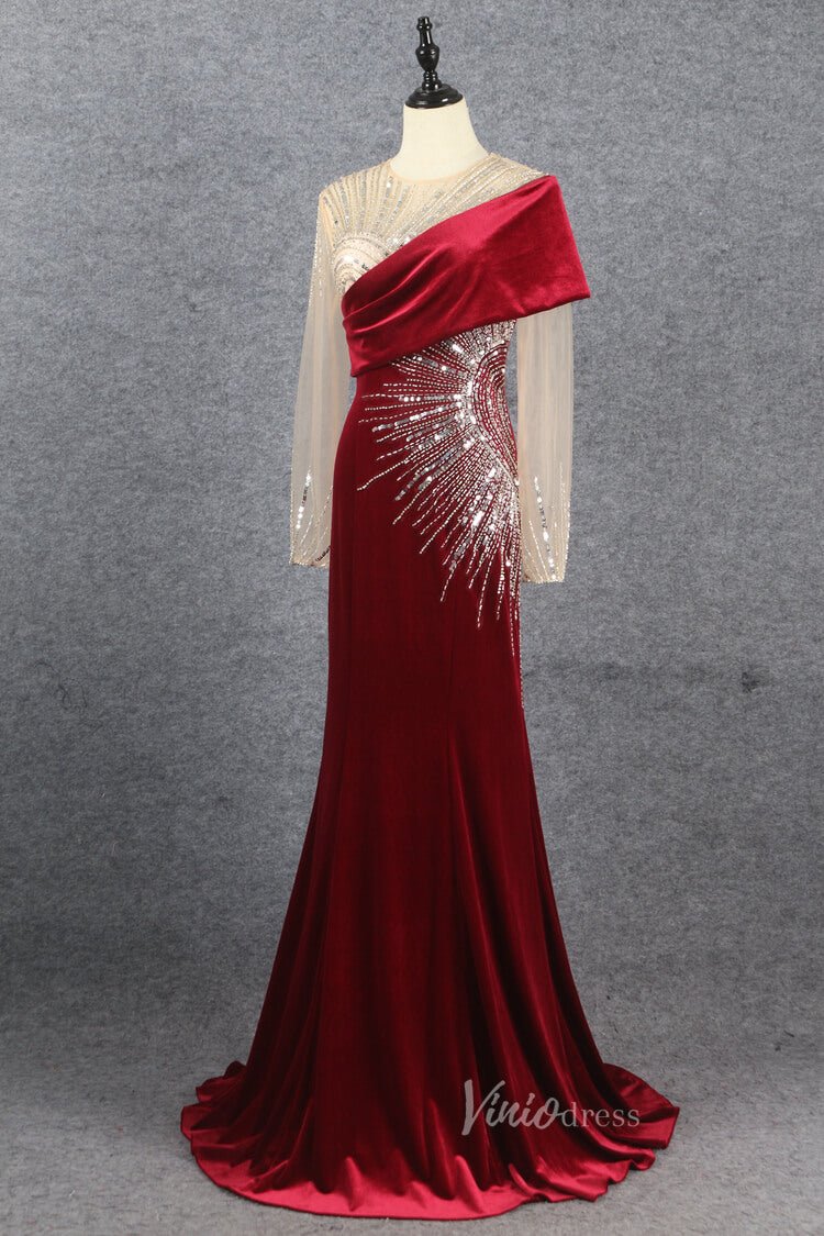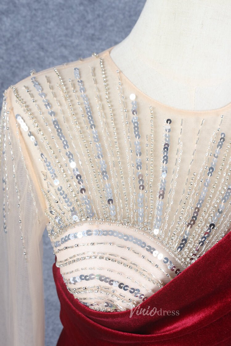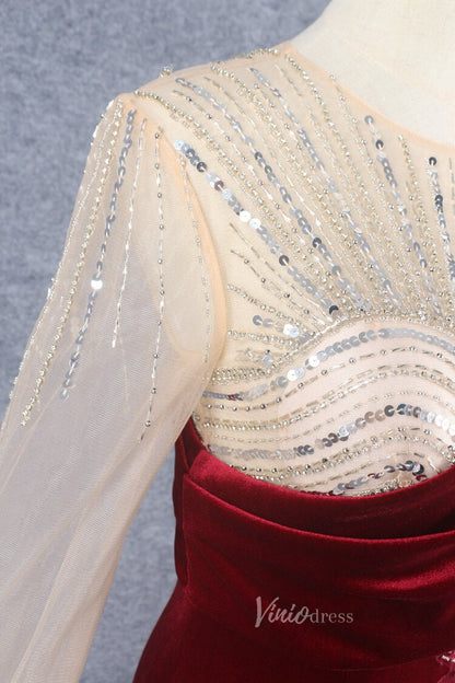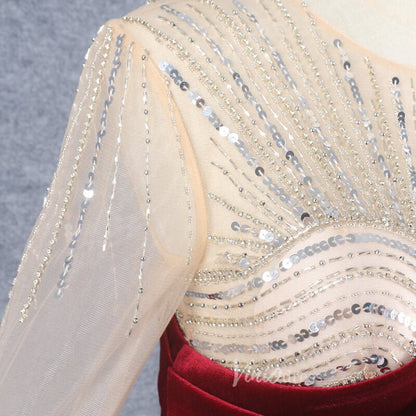 Dark Red Long Sleeve Prom Dress Beaded Velvet Evening Dress FD2608