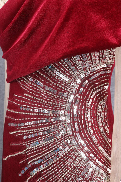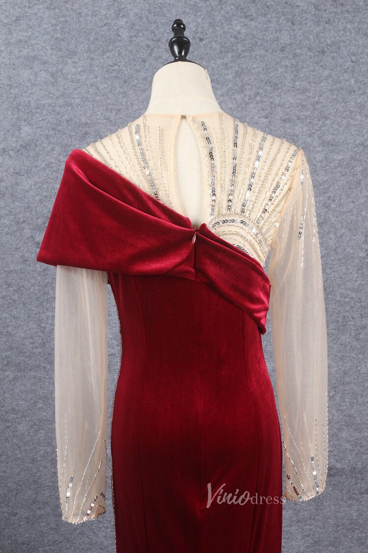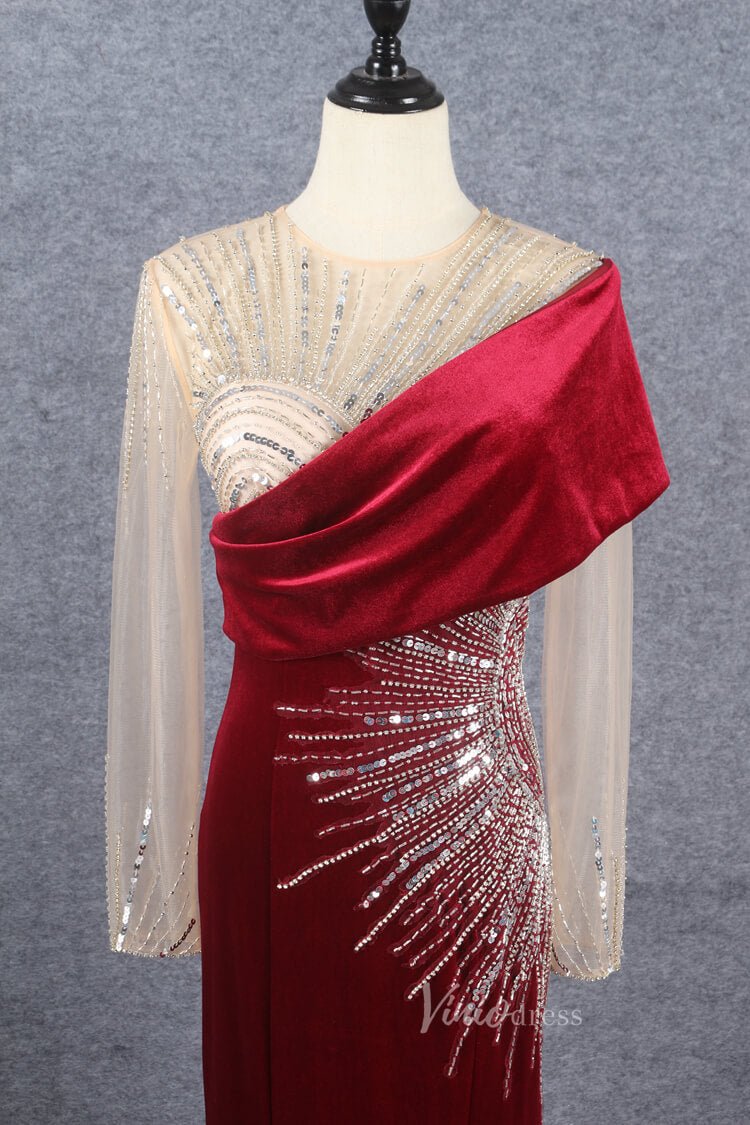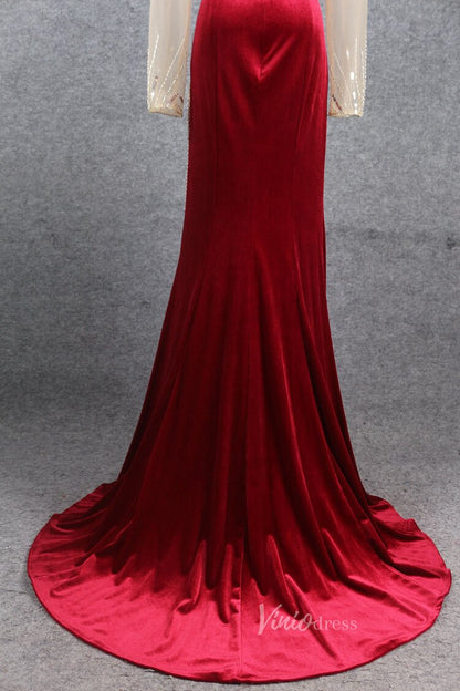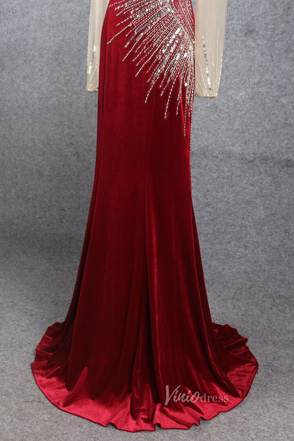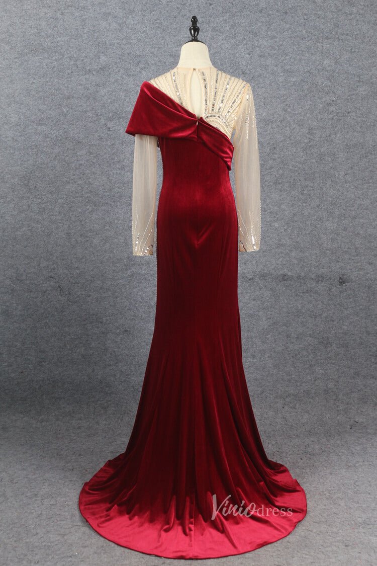 Dark Red Long Sleeve Prom Dress Beaded Velvet Evening Dress FD2608