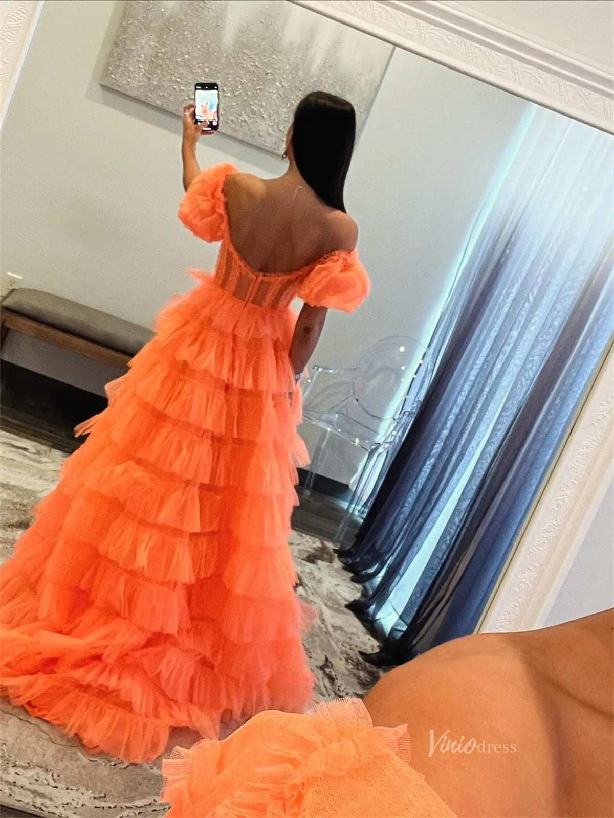 Brighten up your special occasion with this stunning Orange Pleated Tulle Ruffled Prom Dress, designed to capture attention with its bold color and intricate details. The pleated tulle skirt adds volume and texture, while the ruffled layers create a dramatic effect. The puffed sleeves offer a touch of vintage-inspired elegance, and the thigh-high slit adds a modern, sultry edge. Perfect for prom, galas, or any formal event, this dress combines timeless glamour with contemporary style.