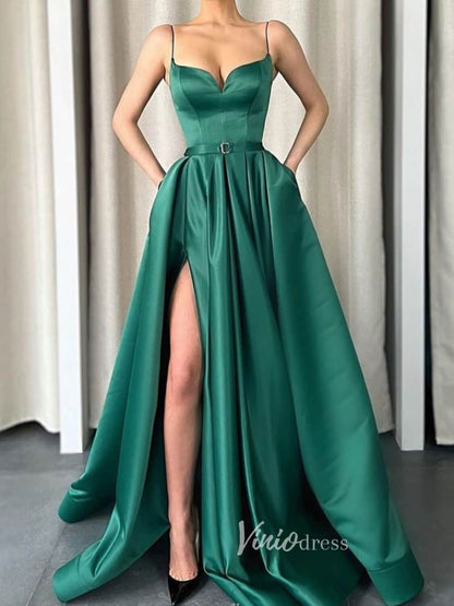 Elegant satin prom dress features spaghetti strap, high slit, and belt.