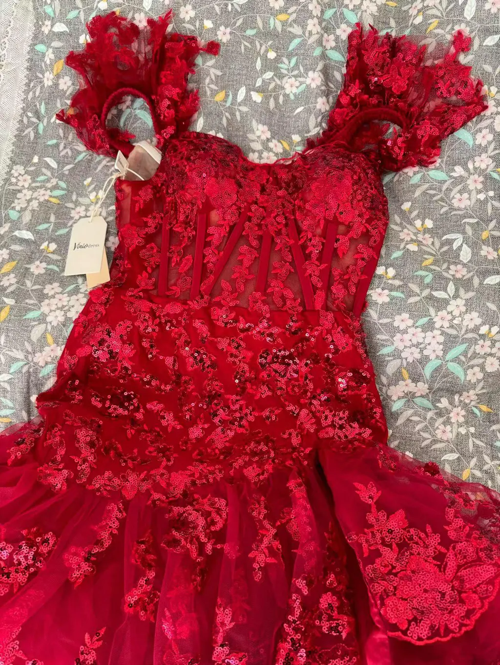 Experience the height of luxury in this breathtaking off-the-shoulder sequin lace prom dress. With its tiered hemline and chic ruffle detailing, you'll stand out like a star on your most special night. The added slit detail adds a subtle and elegant touch to this exquisite dress.