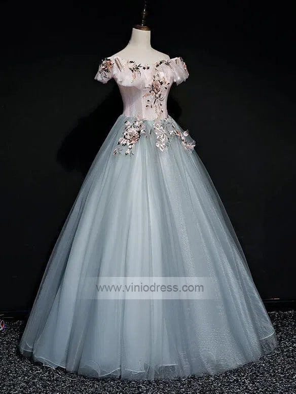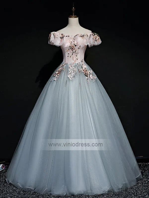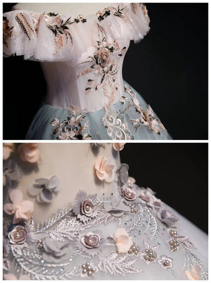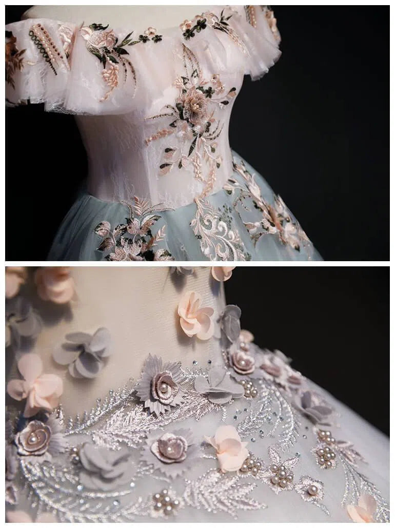 • Sage green tulle ball gown quinceañera dress • Off-the-shoulder formal ball gown neckline • Boned bodice ball gown for structure and support • Colorful floral embroidery appliqués on layered tulle • Flowing skirt with 1-meter long train • Adjustable corset back quinceañera dress • Ideal for quinceañera, gala events, debuts, or weddings