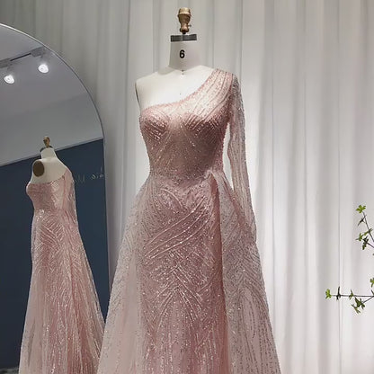 One Shoulder Long Sleeve Pink Beaded Lace Prom Dresses Overskirt Evening Dress 20088