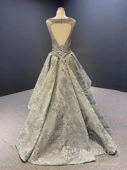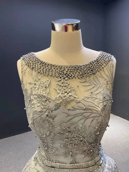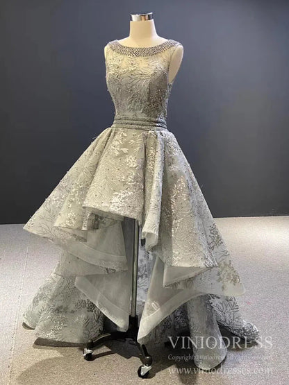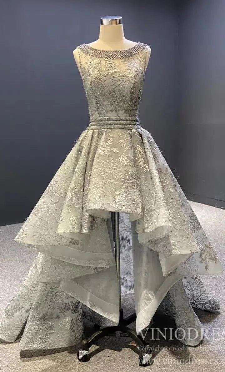 Grey Pearl Lace Prom Dresses Open Back High Low Evening Gowns 66595
