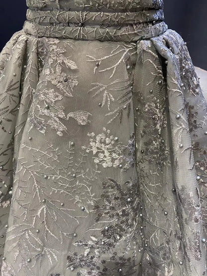 This stunning high-low dress is the perfect choice for your special occasion. Crafted with high-quality grey pearl lace with dusty blue hue, it features an open back, along with a high-low hemline for an elegant, glamorous look. Perfect for any formal event, you'll make a show-stopping entrance in this gorgeous gown.