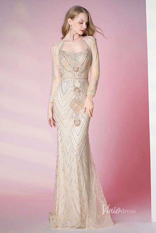 Pale Champagne Beaded Prom Dress Long Sleeve 20s Formal Dress FD2791