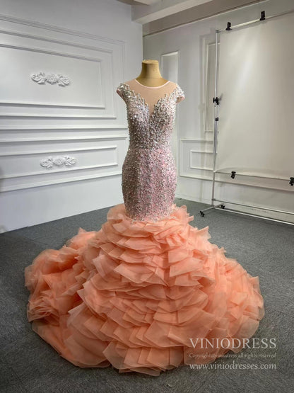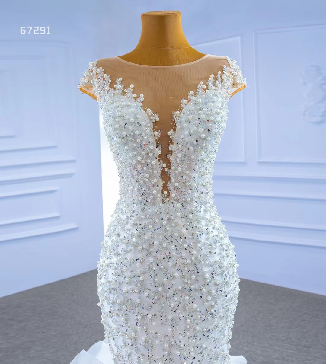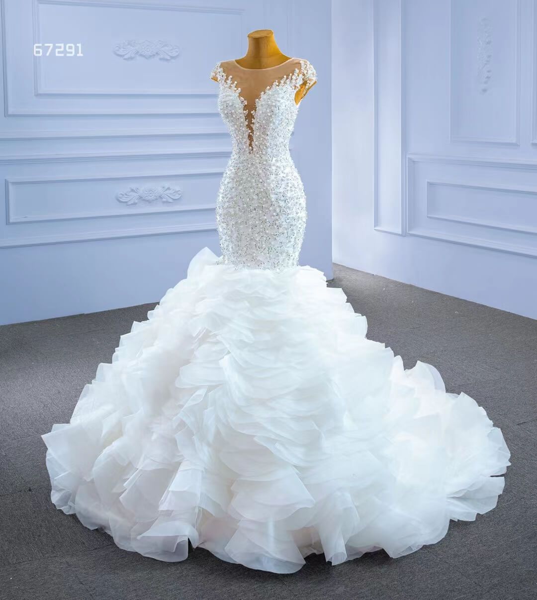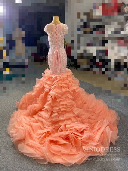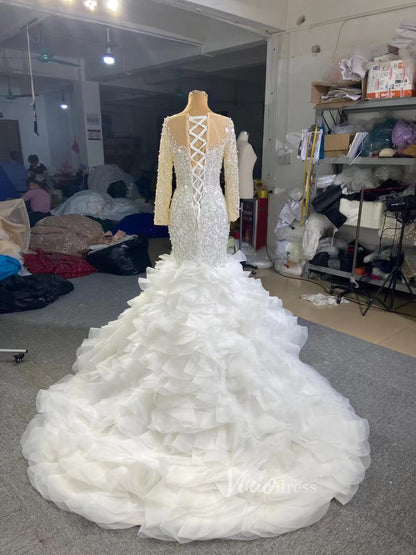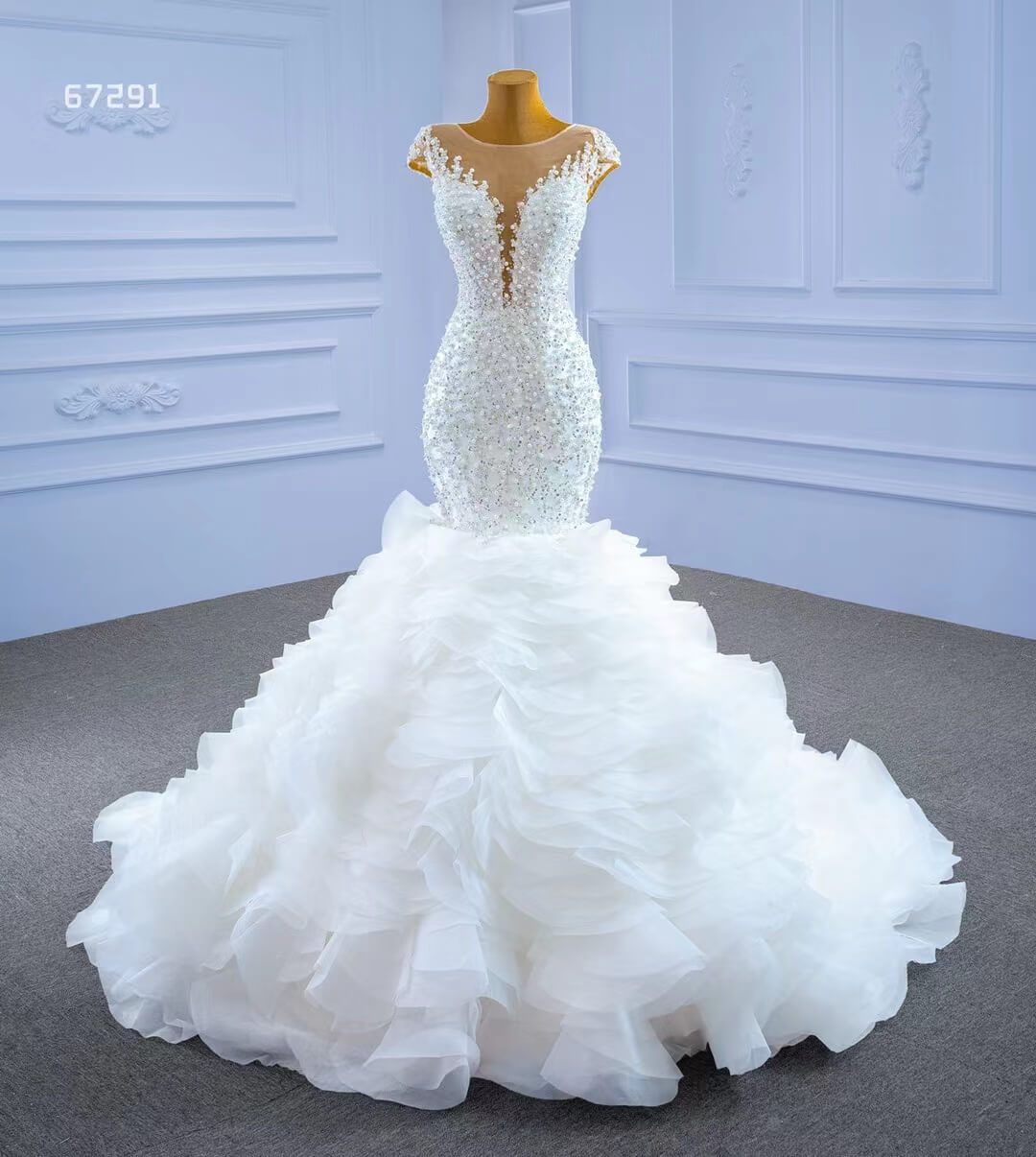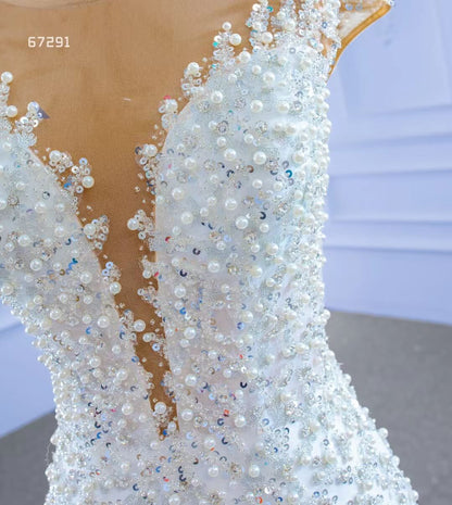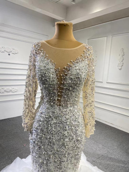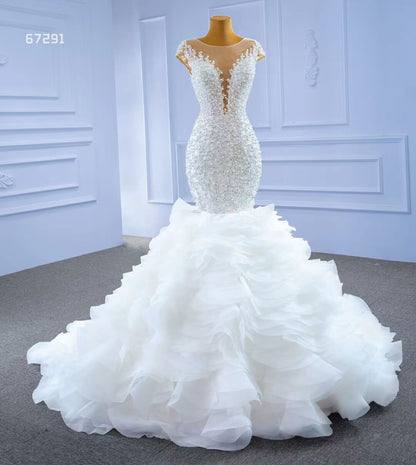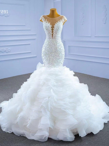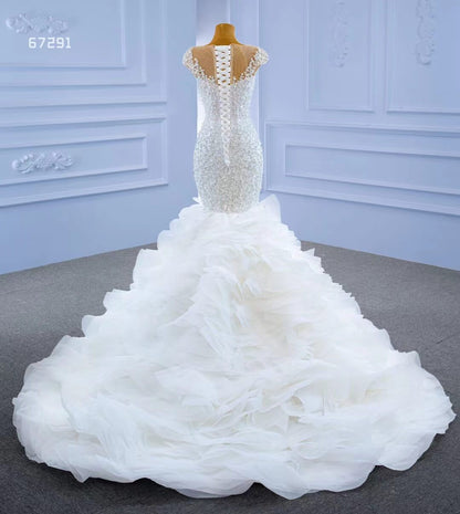 Make a statement in this Luxury Pearl Beaded Mermaid Ruffle Wedding Dress 67291! The exquisite pearl beading adds an elegant touch, while the delicate ruffle on the skirt will have you staircase-ready in no time. Feel beautiful and confident on your big day with this stunning dress!