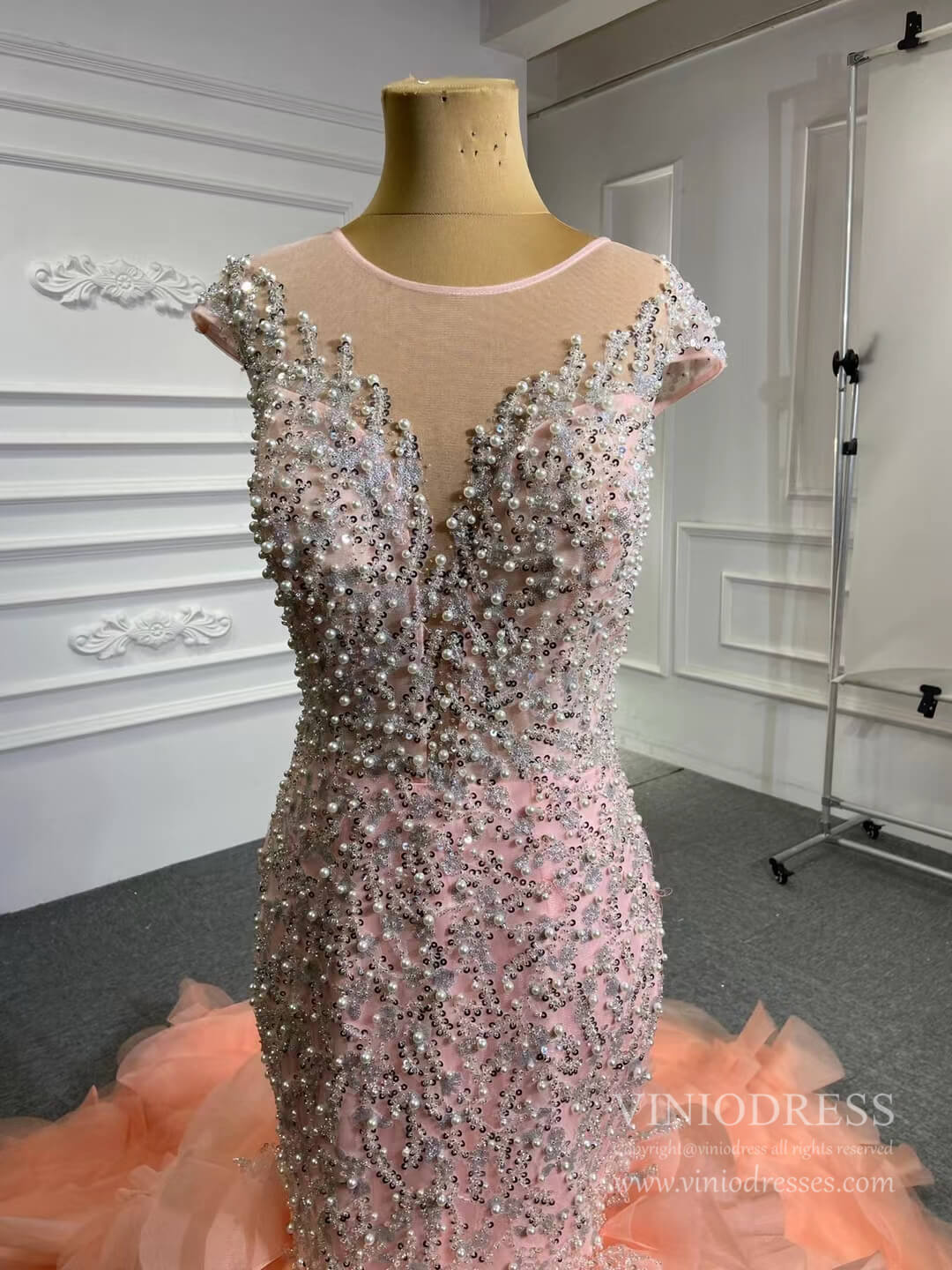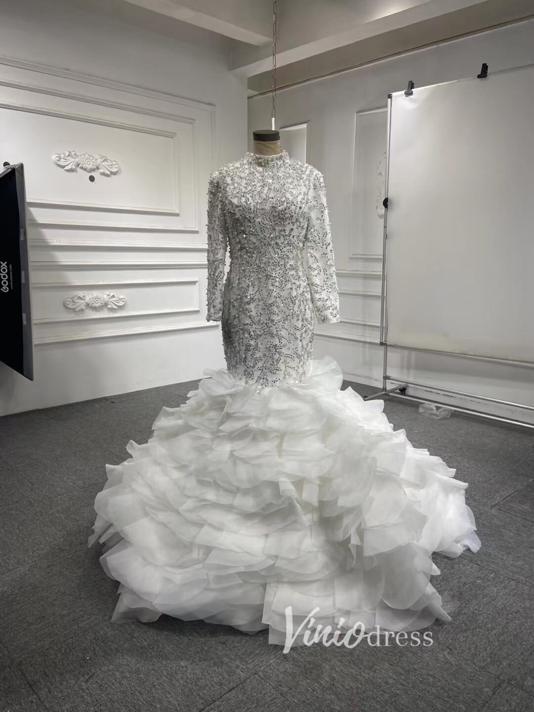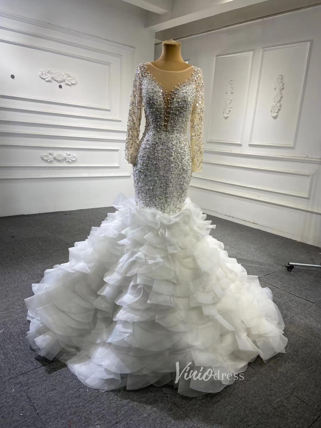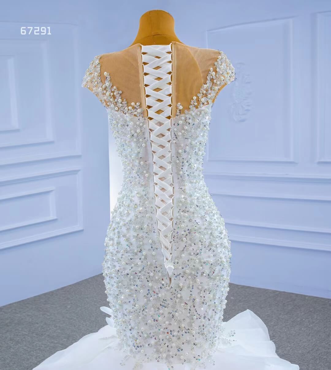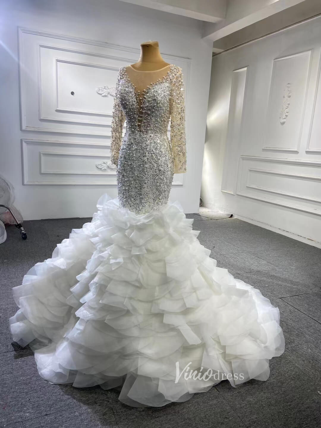 Make a statement in this Luxury Pearl Beaded Mermaid Ruffle Wedding Dress 67291! The exquisite pearl beading adds an elegant touch, while the delicate ruffle on the skirt will have you staircase-ready in no time. Feel beautiful and confident on your big day with this stunning dress!