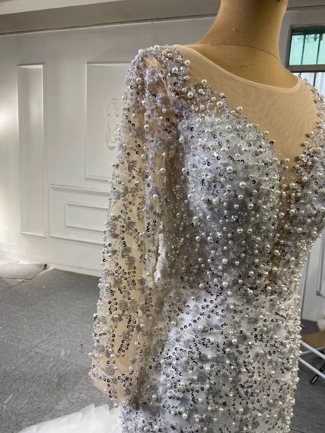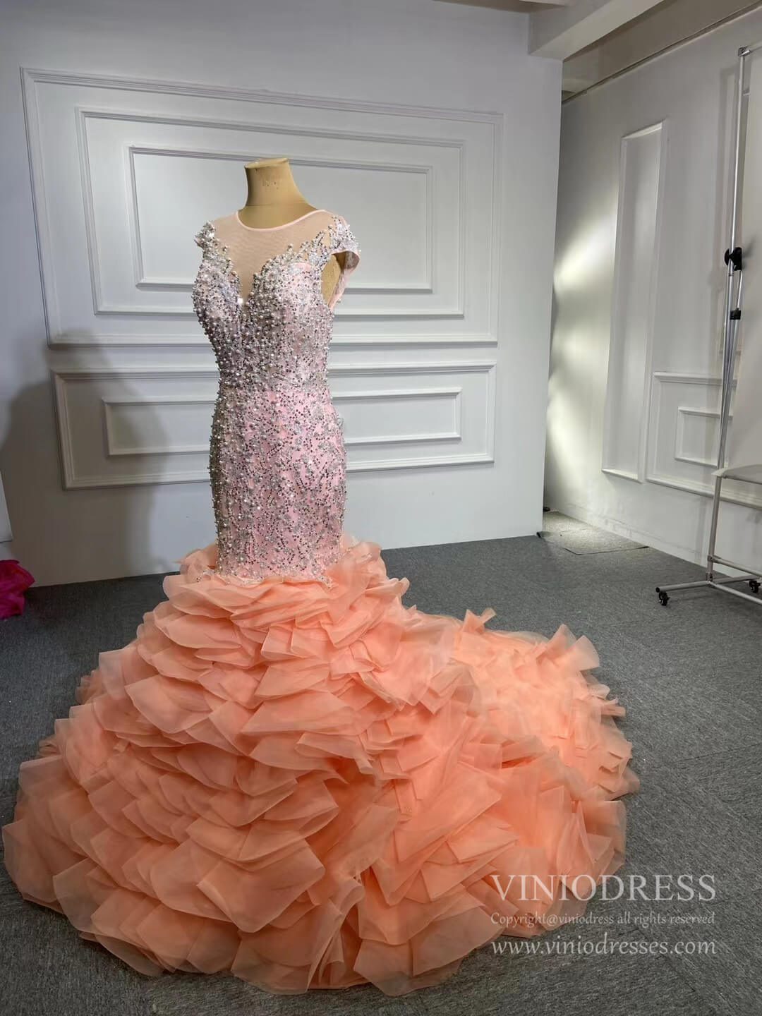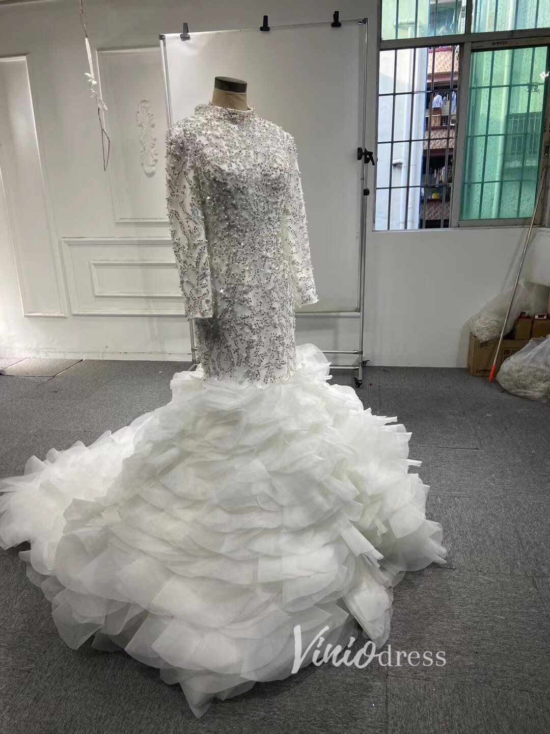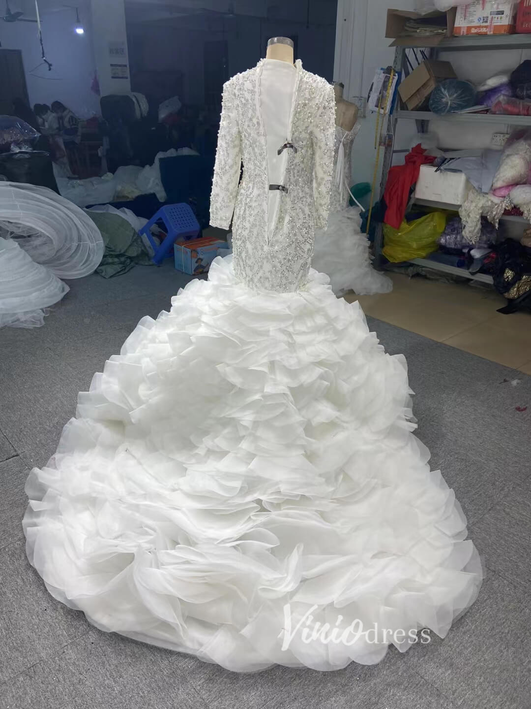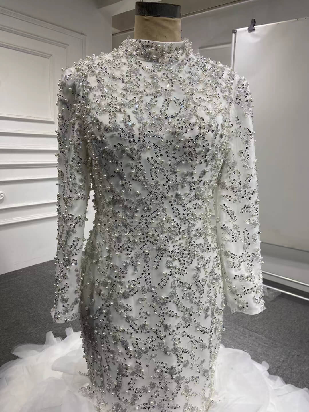 Make a statement in this Luxury Pearl Beaded Mermaid Ruffle Wedding Dress 67291! The exquisite pearl beading adds an elegant touch, while the delicate ruffle on the skirt will have you staircase-ready in no time. Feel beautiful and confident on your big day with this stunning dress!