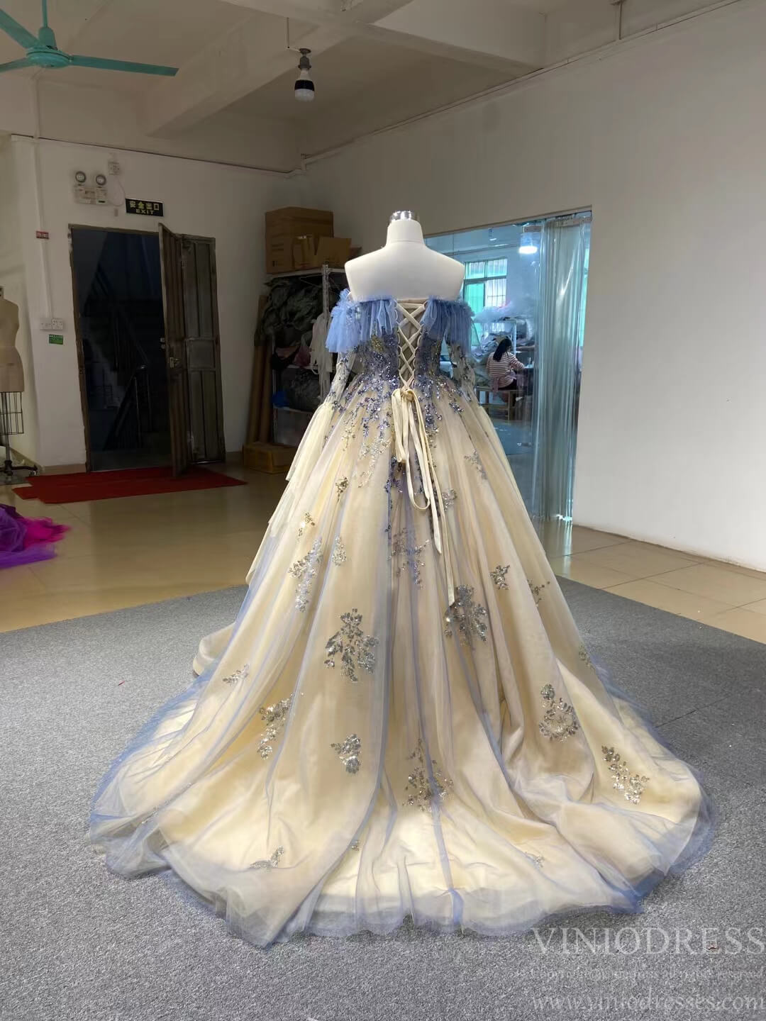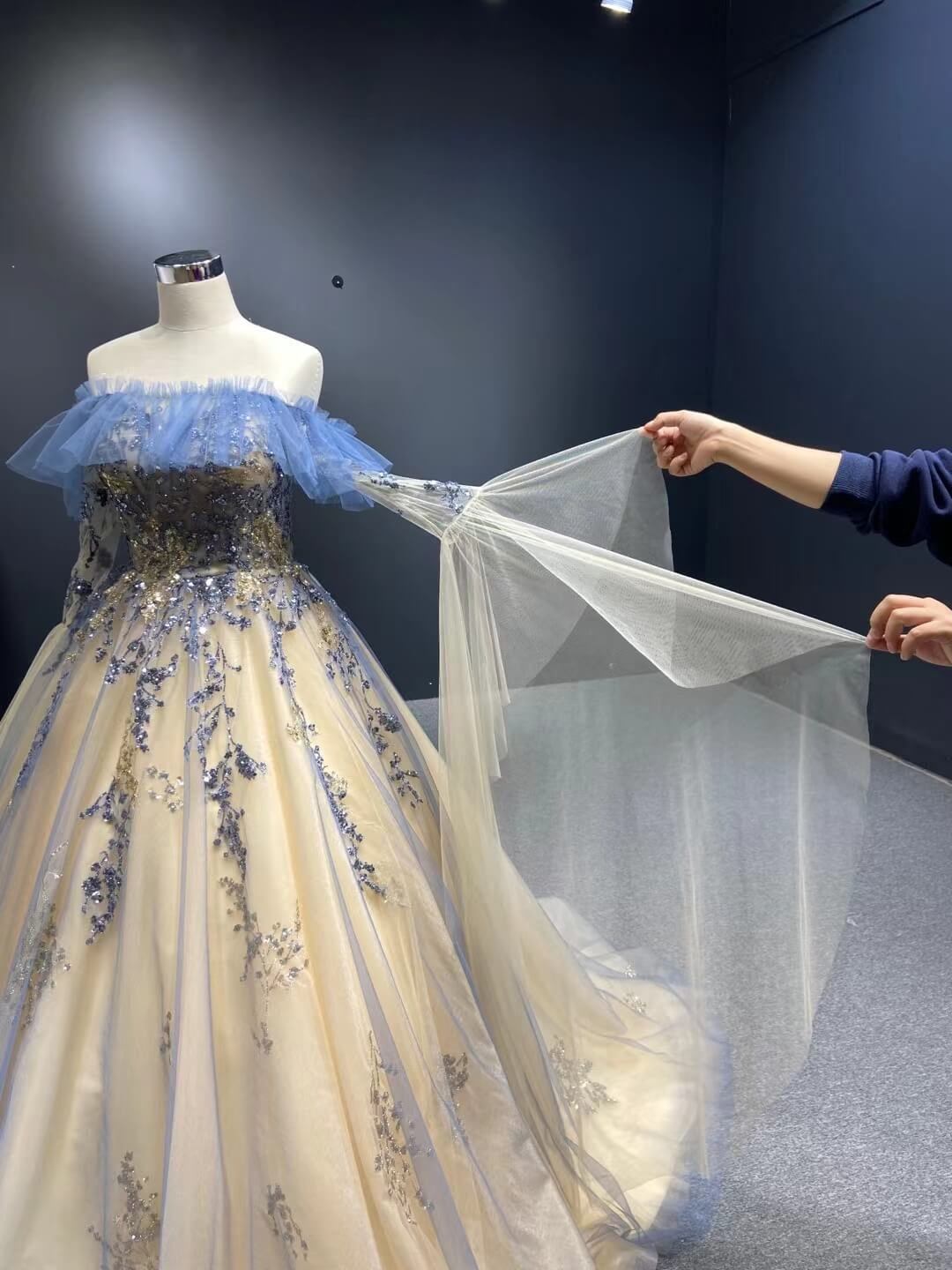 Periwinkle & Champagne tulle ball gown detailing with sparkly appliques.