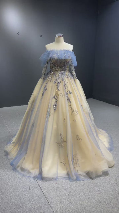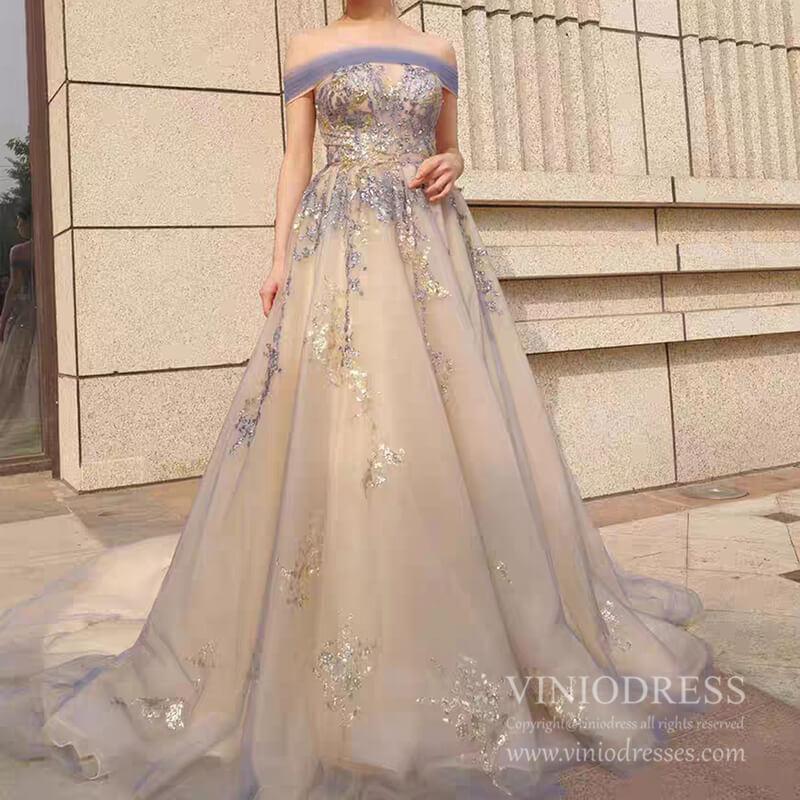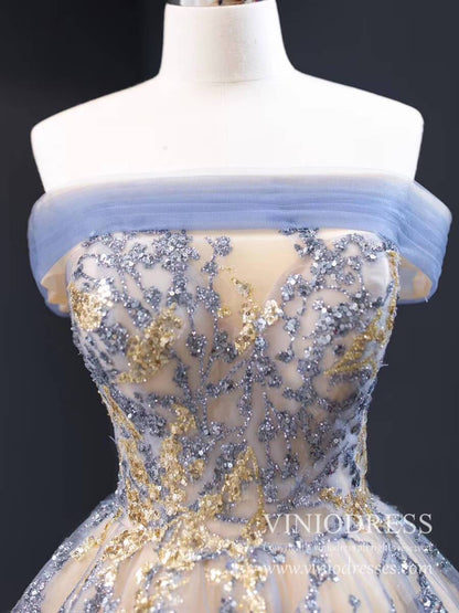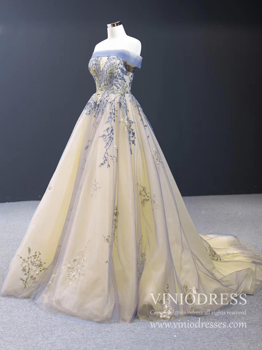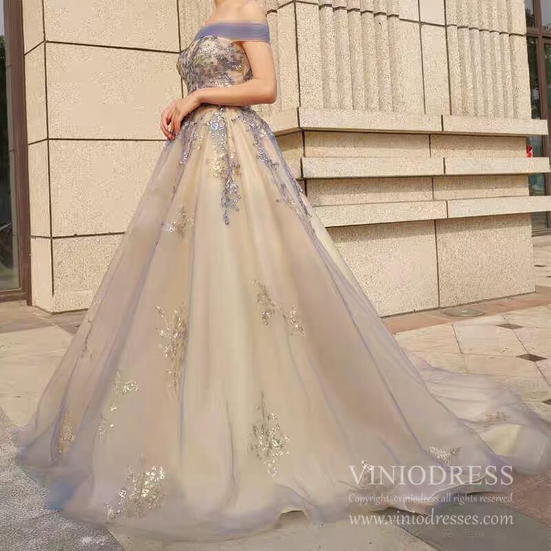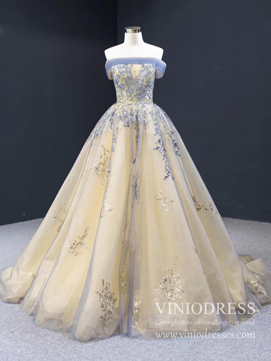 Champagne Long Prom Dresses Off the Shoulder Ball Gown 66957 Viniodress
