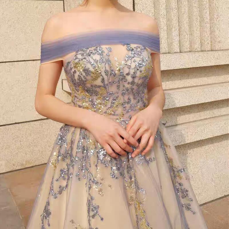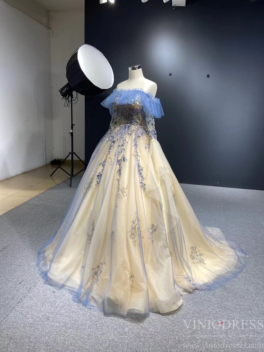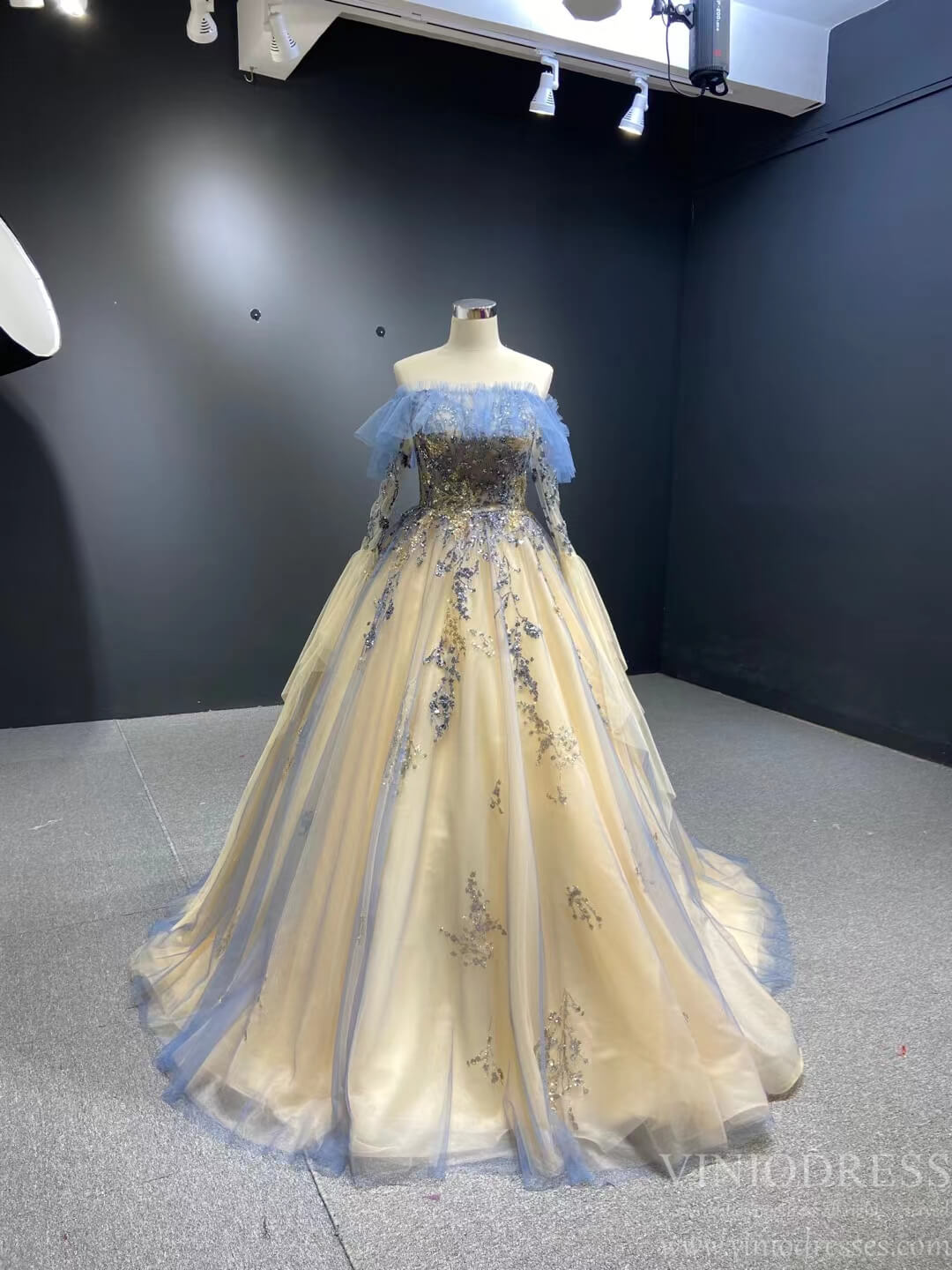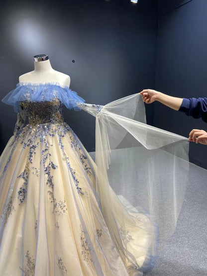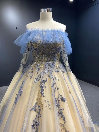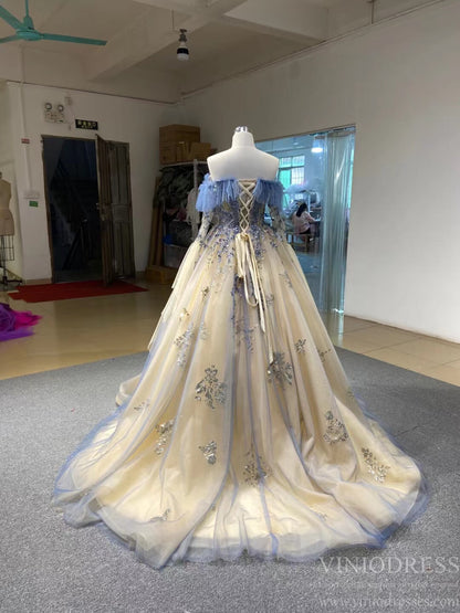 Champagne Long Prom Dresses Off the Shoulder Ball Gown 66957 Viniodress