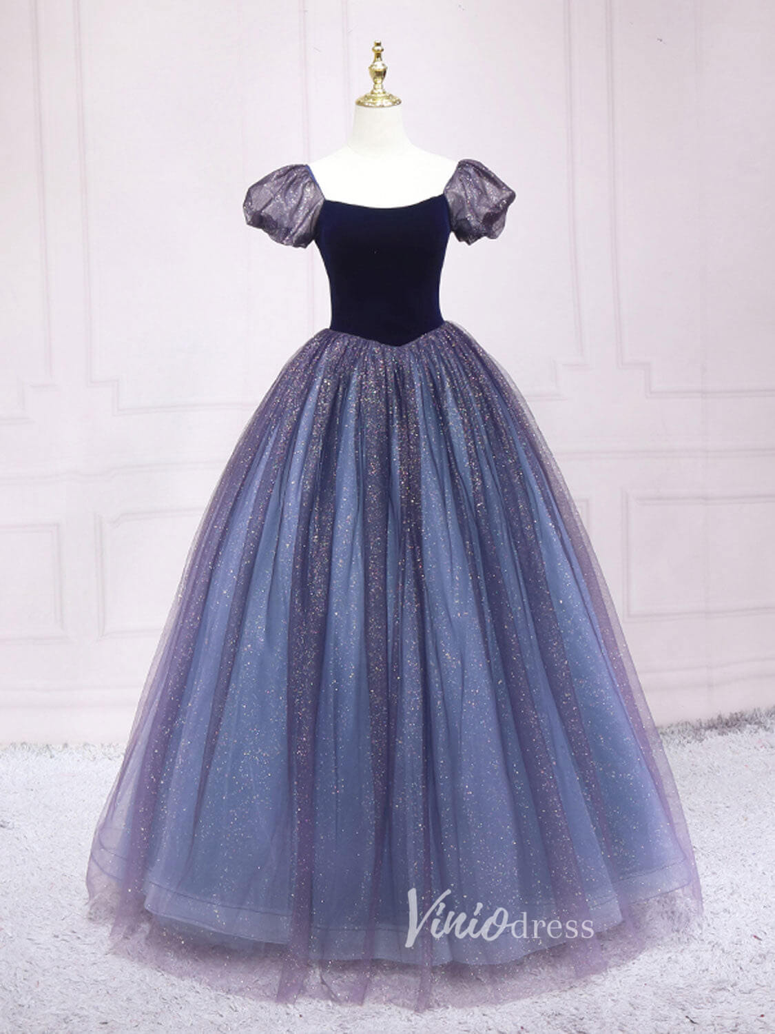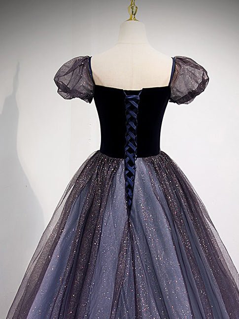 Elegant a-line prom dress features puffed sleeve, velvet bodice, and sparkly tulle bottom.