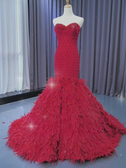 Red Feather Mermaid Wedding Dresses Strapless Pageant Dress 222198