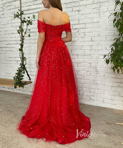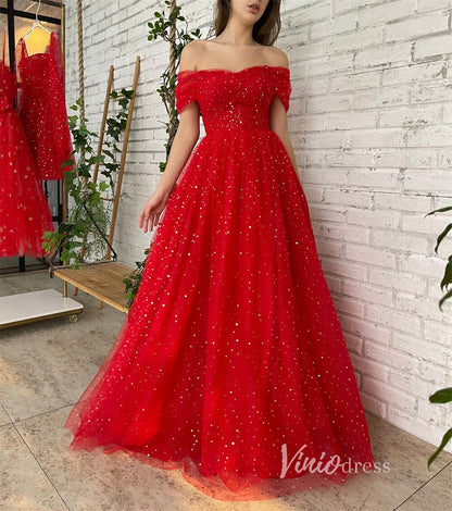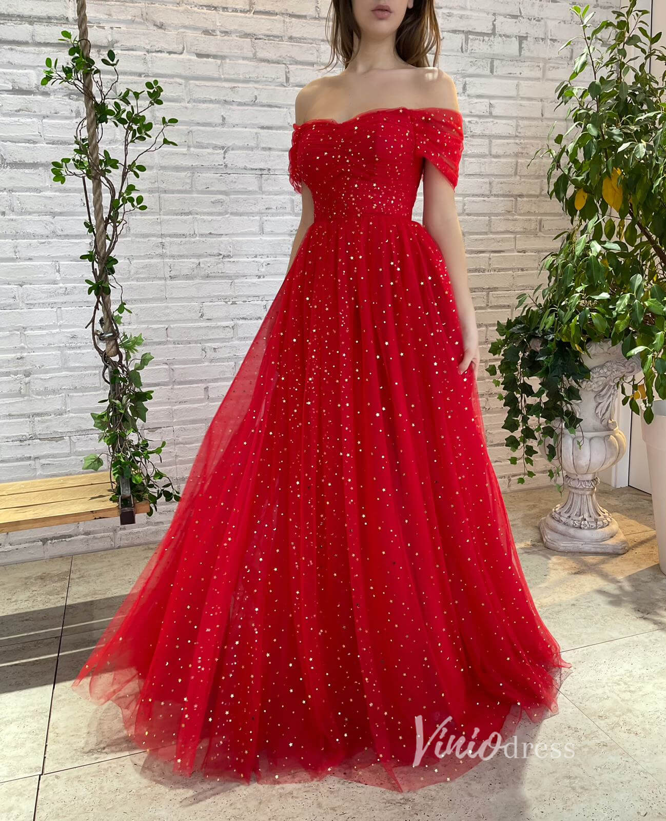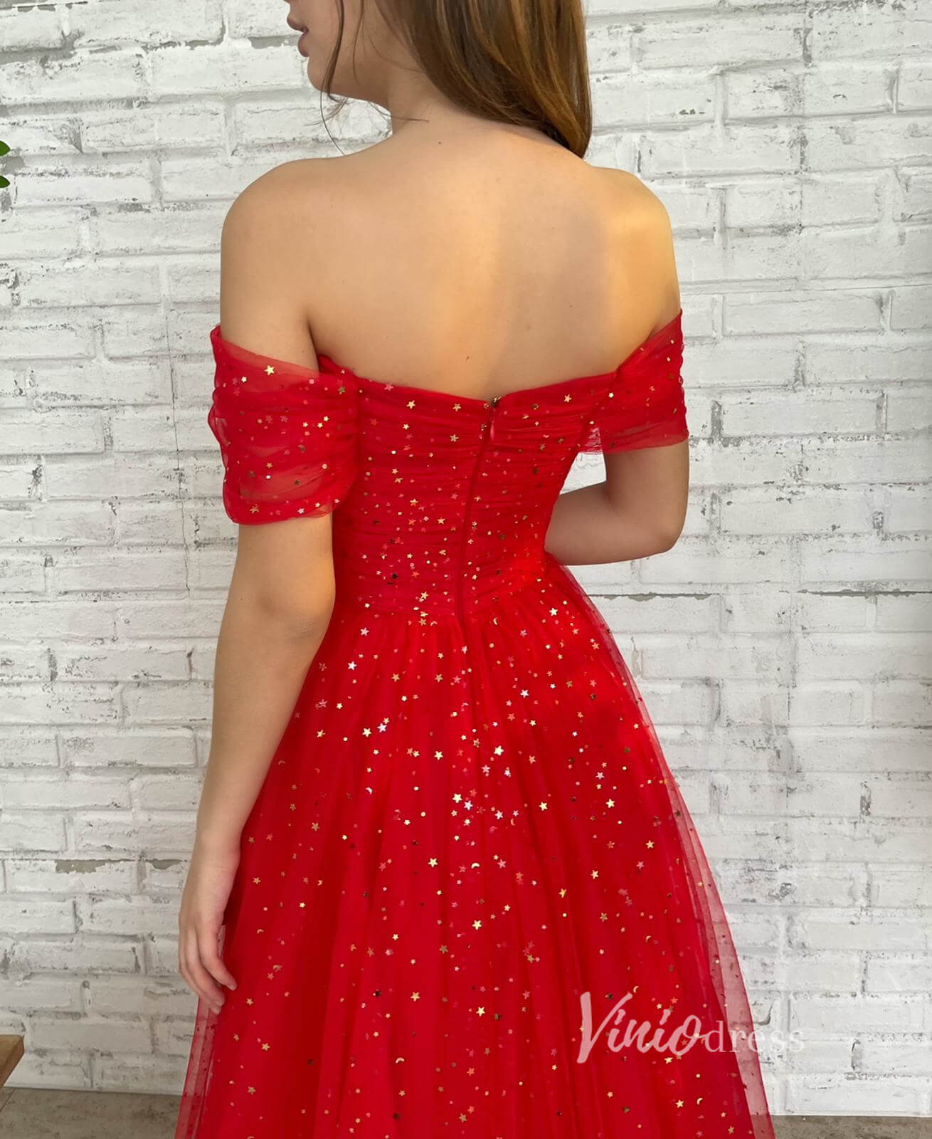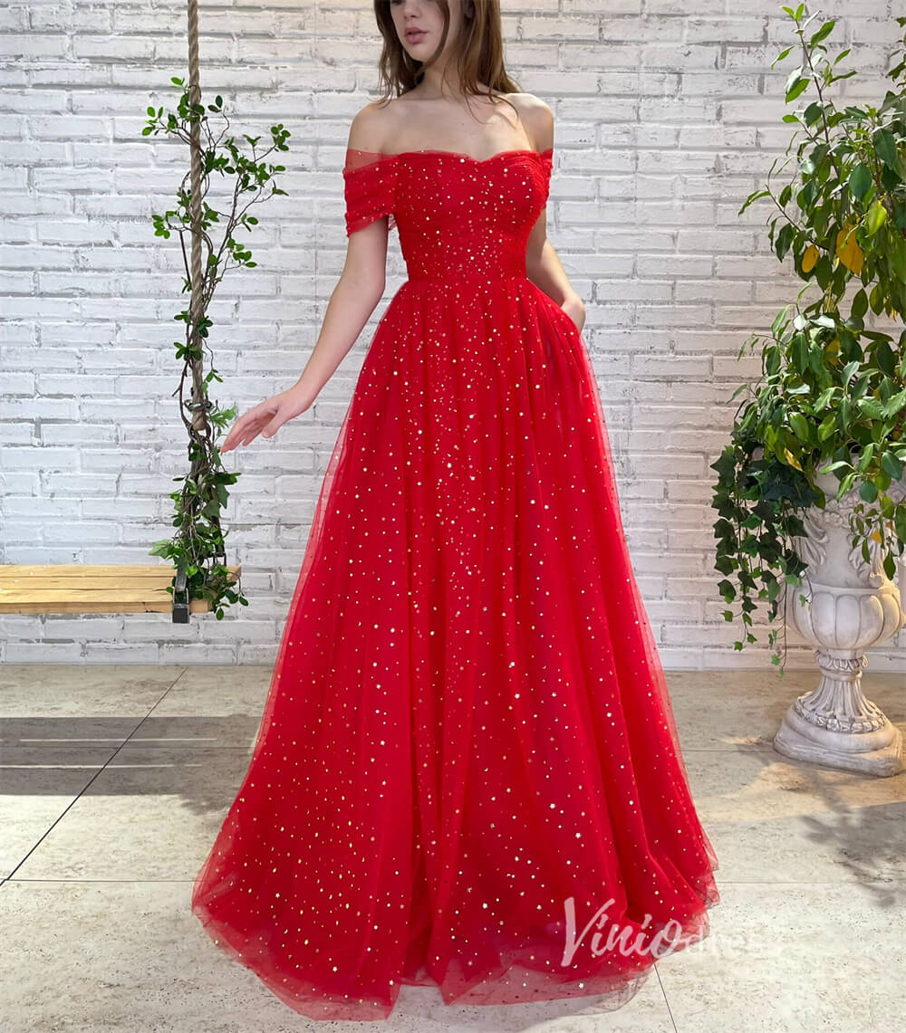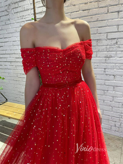 Red Glitter Star Prom Dress with Pockets Off the Shoulder Formal Dresses SD1437L