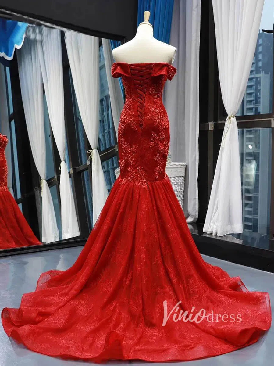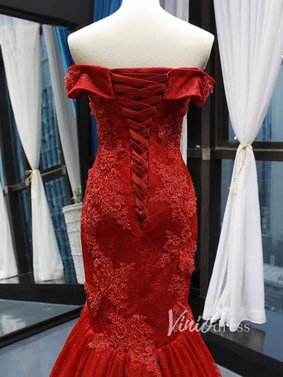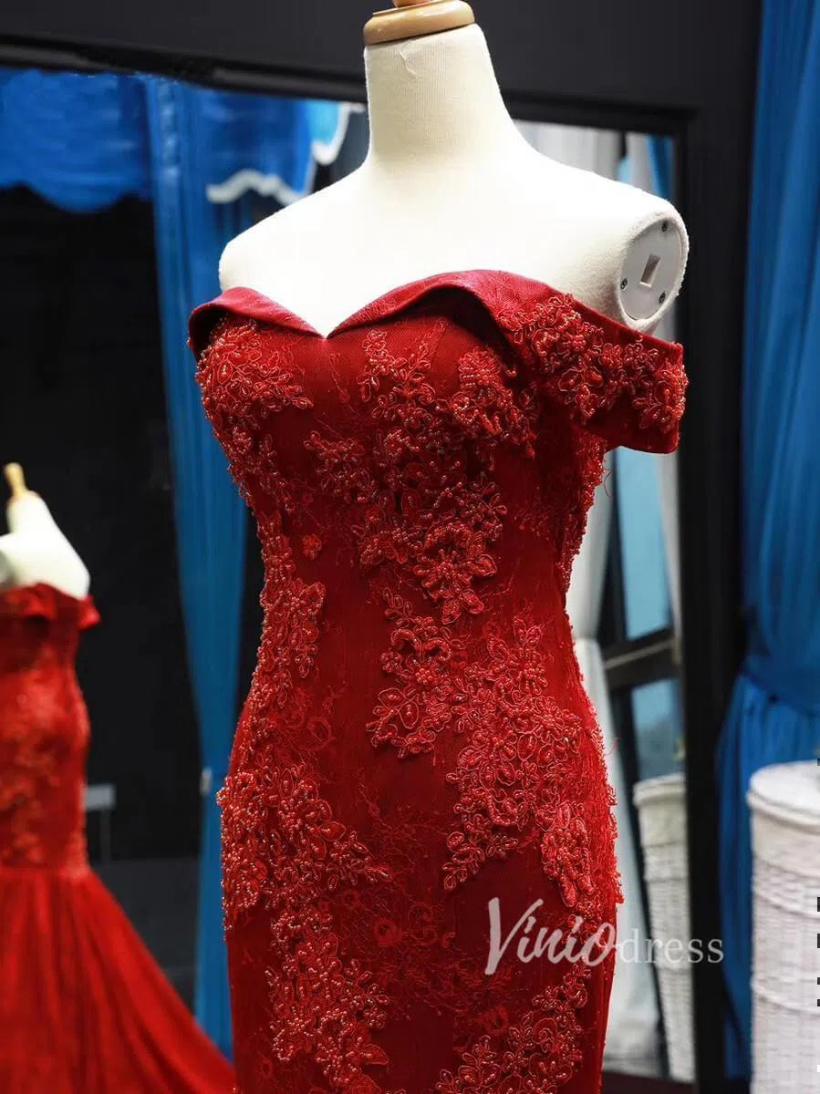 Red Mermaid Lace Prom Dresses Off Shoulder Trumpet Prom Gowns FD1273