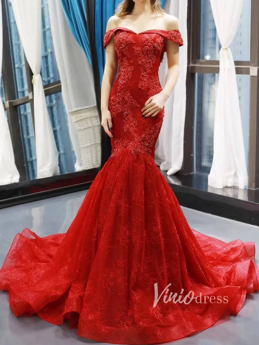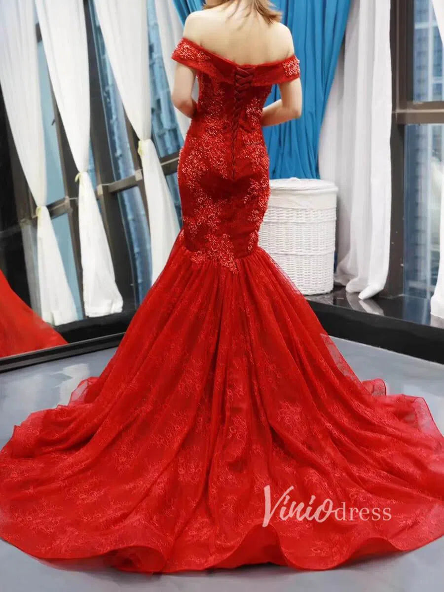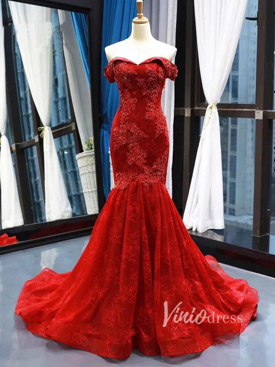 Red Mermaid Lace Prom Dresses Off Shoulder Trumpet Prom Gowns FD1273