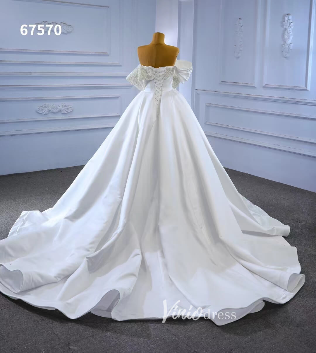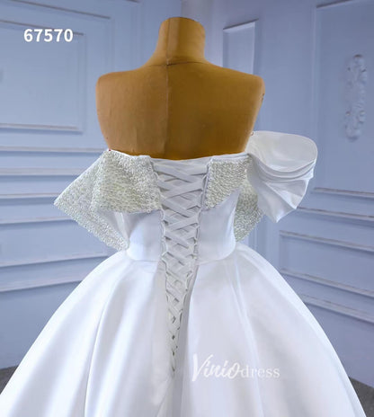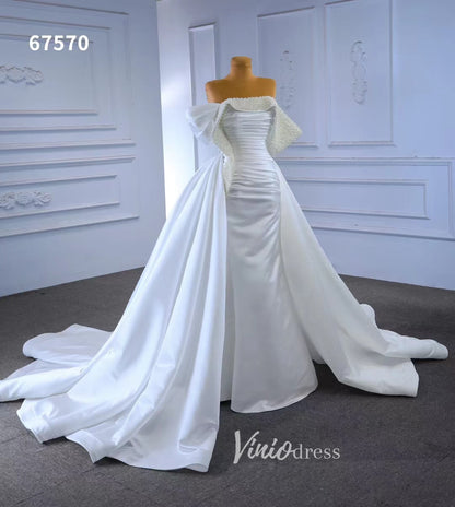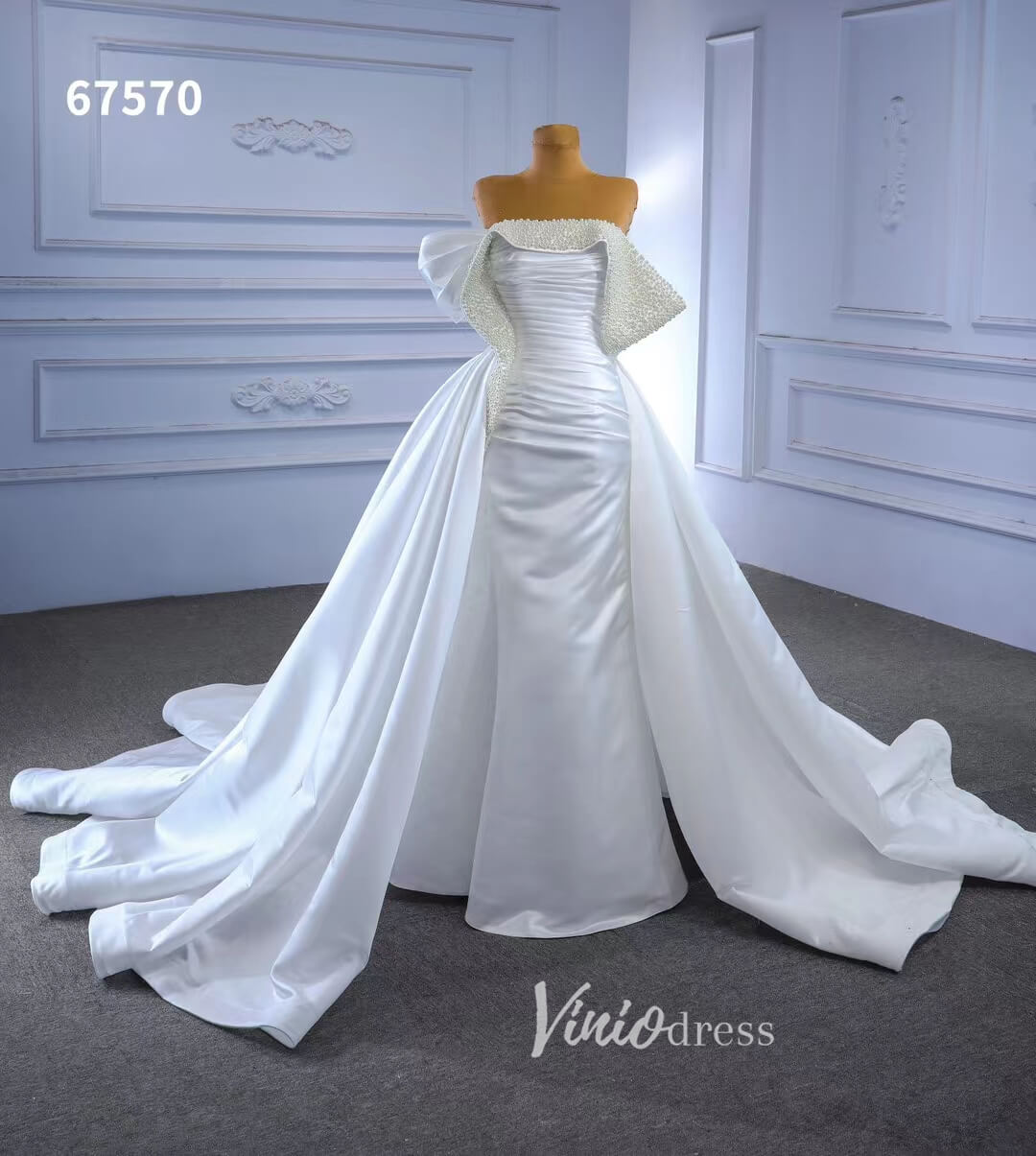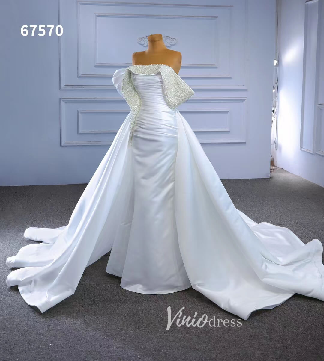 The Satin Overskirt Pearl Wedding Dress 67570 is an exquisite piece of bridal couture, perfect for the timelessly elegant bride. Crafted from silk satin and delicately adorned with pearls, this off-the-shoulder design celebrates the beauty of simplicity with its classic, minimal silhouette. An exquisite gown for your special day.