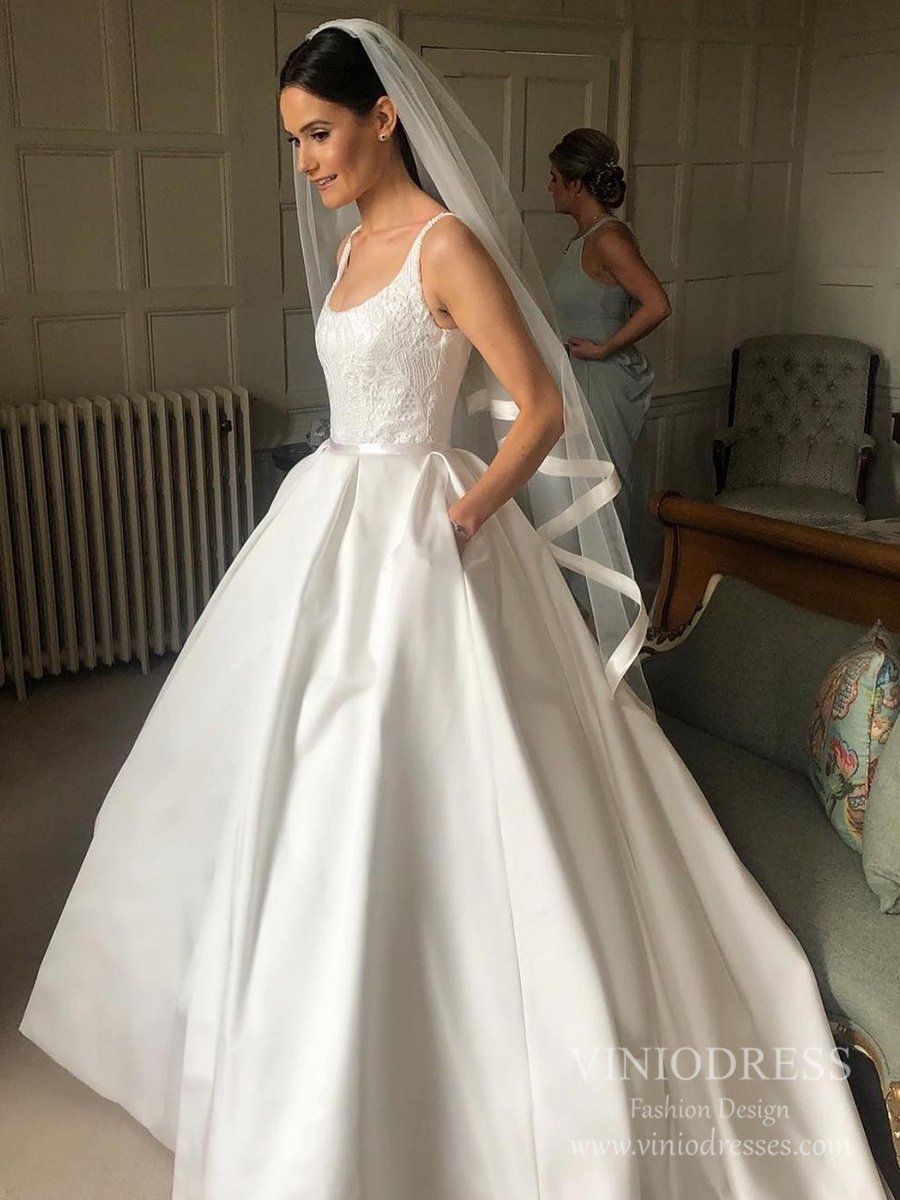 - Ivory crepe satin fabric with smooth, elegant drape - Square neckline for a clean, modern look - Puff sleeves with soft volume - Fitted waist and flattering A-line silhouette - Waist bow detail at the back for a romantic touch - Button-back closure for classic bridal styling - Chapel train for graceful aisle drama