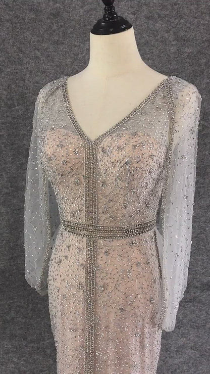 Silver Beaded Prom Dresses V-neck Long Sleeve Evening Dress FD2611