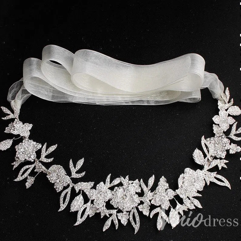 Silver Crystal Floral Bridal Sash with Ivory Ribbon ACC1144