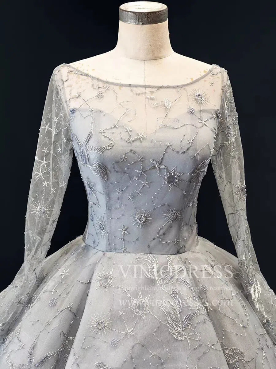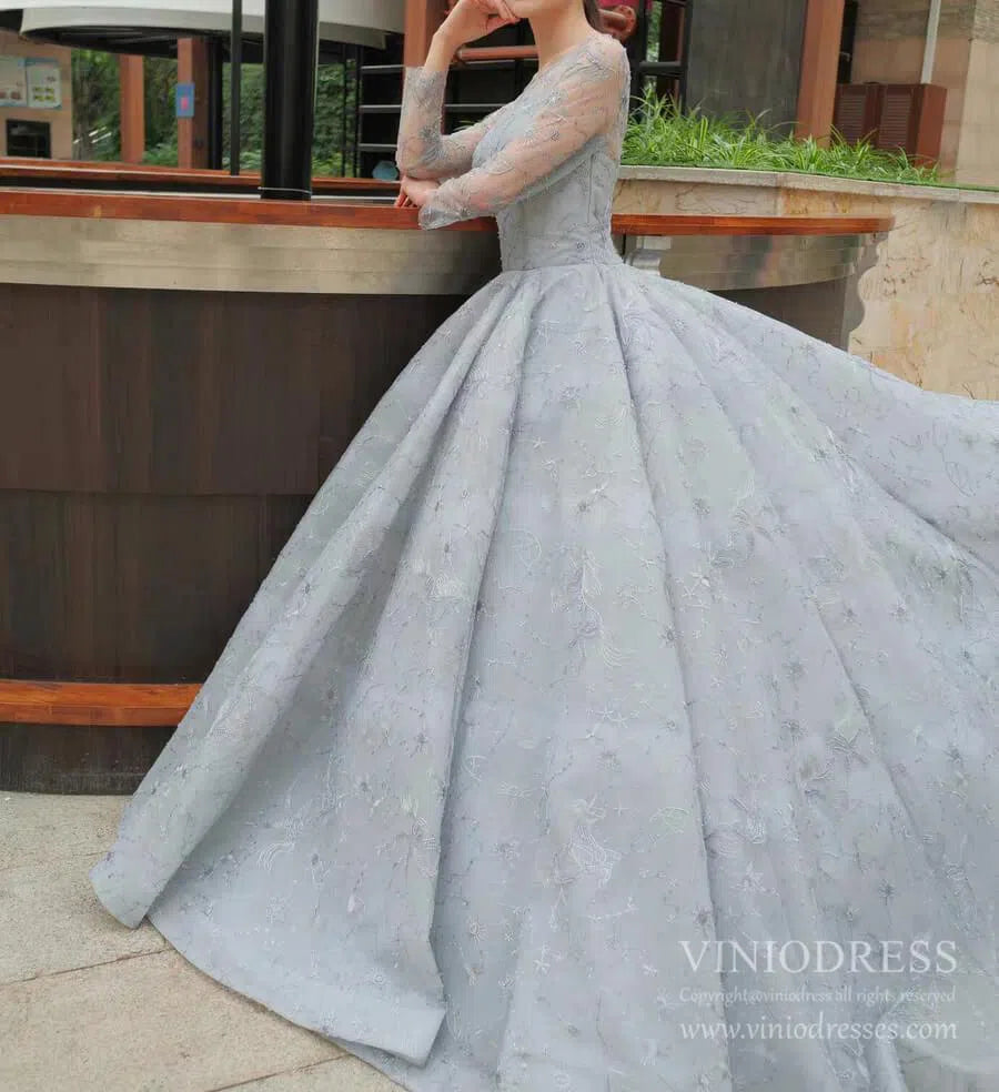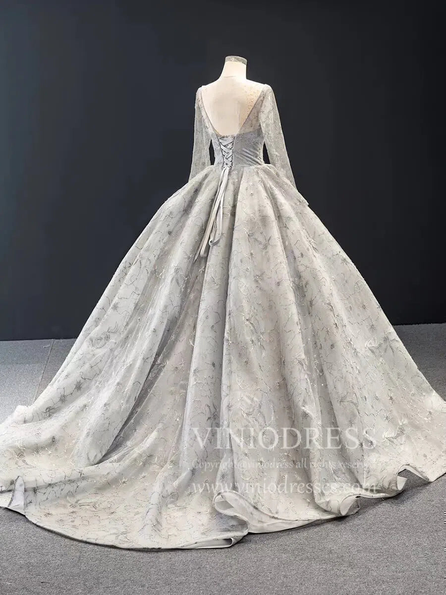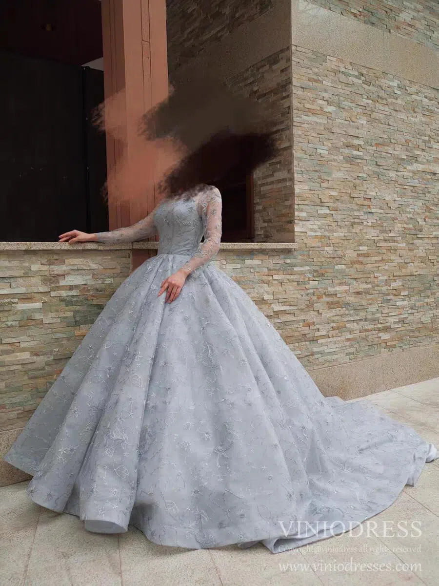 Silver Emboridered Long Sleeve Sweet 16 Dresses Ball Gown Quince Dress FD1742 viniodress