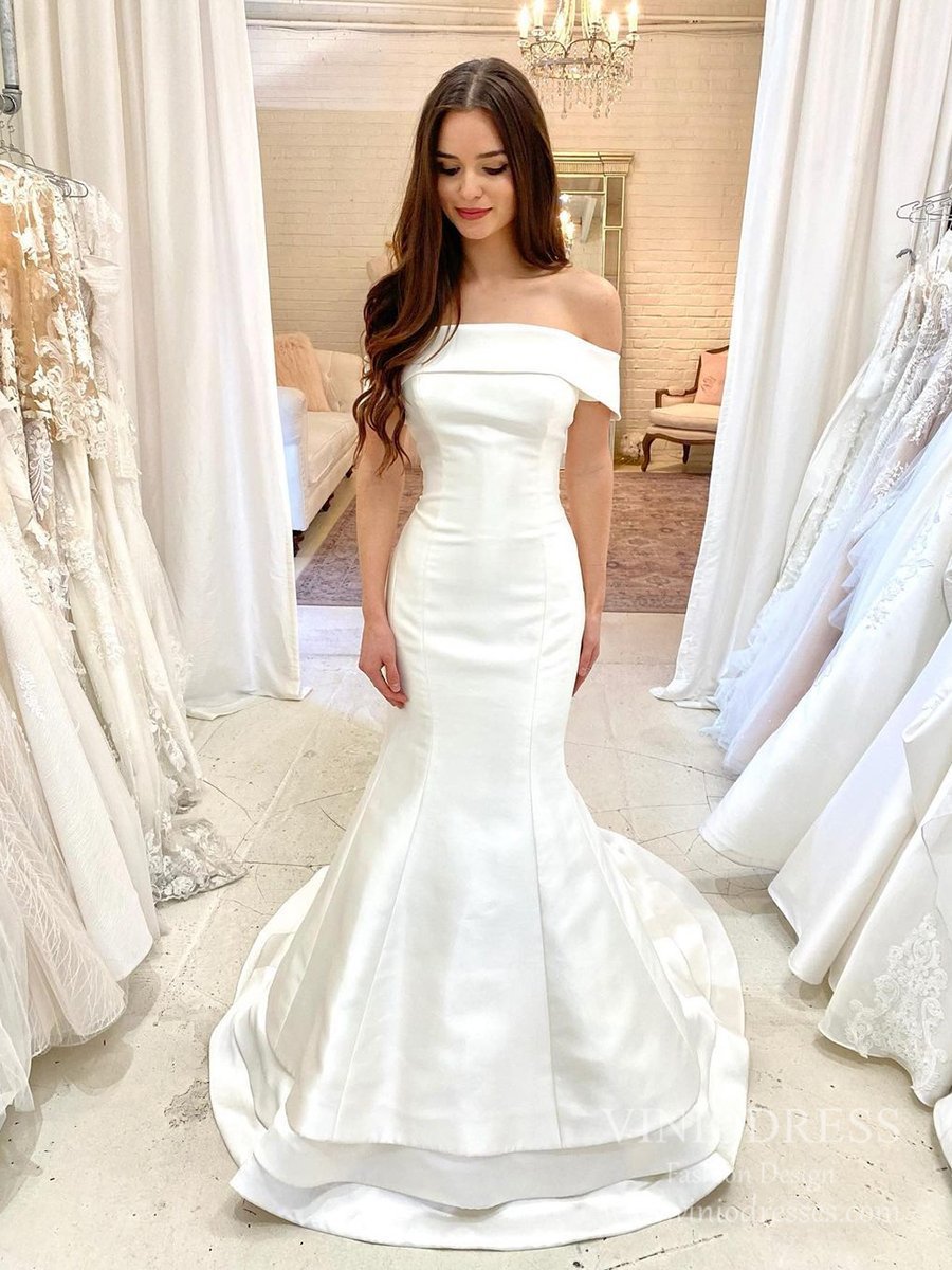 This timeless and elegant satinwedding dress is crafted in sleek satin and designed with a sculpted off-shoulder folded neckline that beautifully frames your collarbone. The structured mermaid silhouette creates a smooth, figure-enhancing shape, while the dramatic button-down train adds classic bridal charm. Finished with a subtle illusion lace-up back, this gown blends modern minimalism with refined sophistication.