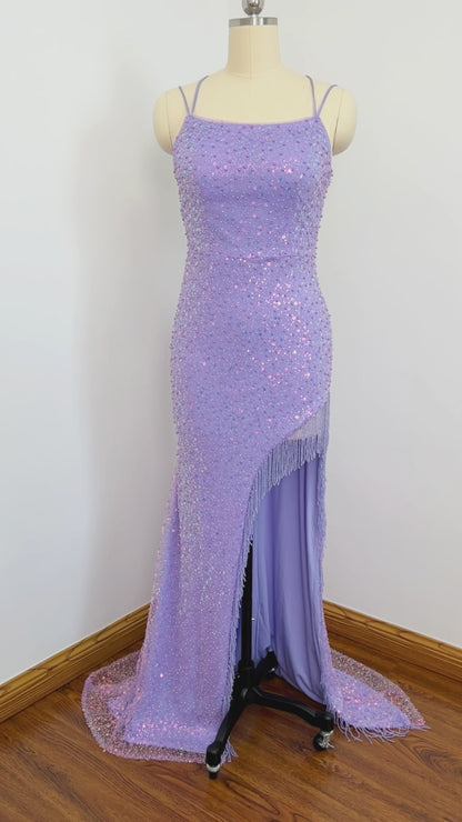 This elegant evening dress will make you look and feel like royalty. It is made with beaded lace and decorated with handmade dangling beads. It features spaghetti straps and a lace-up back with a high slit for an added touch of glamour. Available in multiple colors, you are sure to find your perfect match.