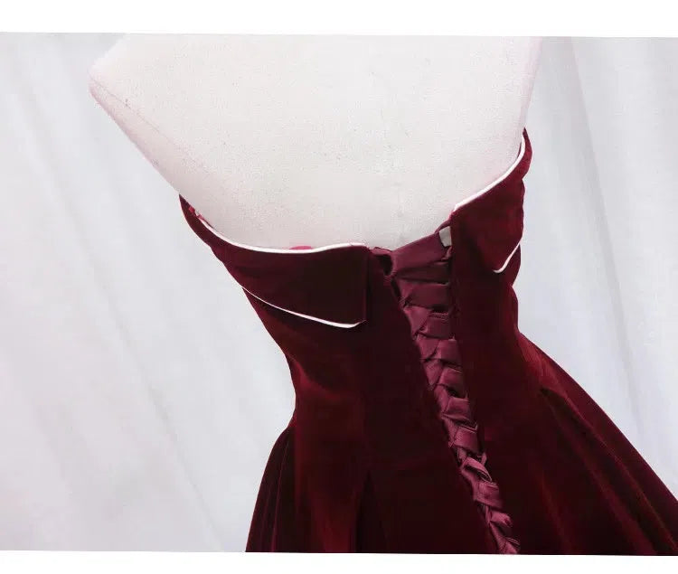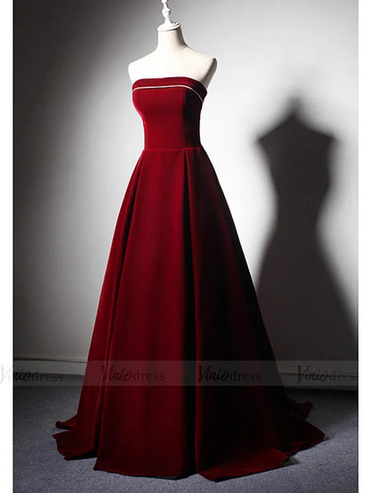 Simple Strapless Burgundy Velvet Prom Dresses Long FD1621