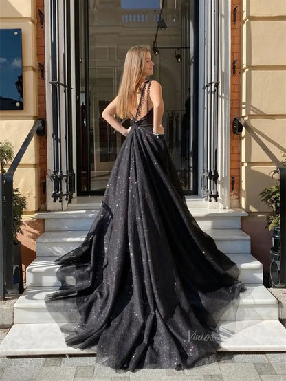 Turn heads and sparkle all night in the Black Sparkly Tulle Prom Dress with V-Neck, Slit & Spaghetti Straps - FD5159. This glamorous gown features a stunning black sparkly tulle fabric that shimmers with every move, creating an enchanting and captivating look. The flattering V-neckline elongates your neck and enhances your silhouette, while the delicate spaghetti straps add a chic, minimalist touch. A daring thigh-high slit adds a bold, sultry element, perfect for showcasing your legs. Ideal for prom, formal dances, or any special occasion, this dress combines elegance with a touch of sparkle, ensuring you make a memorable entrance.