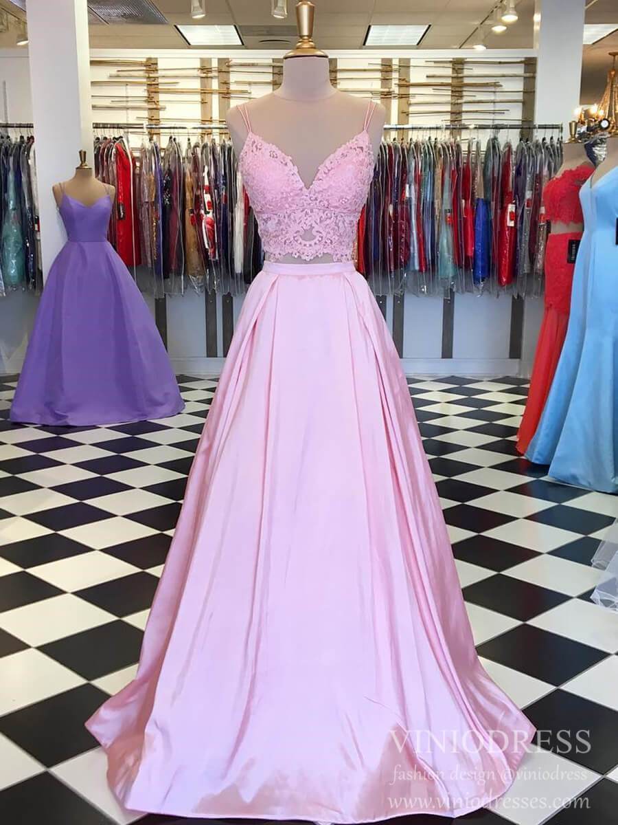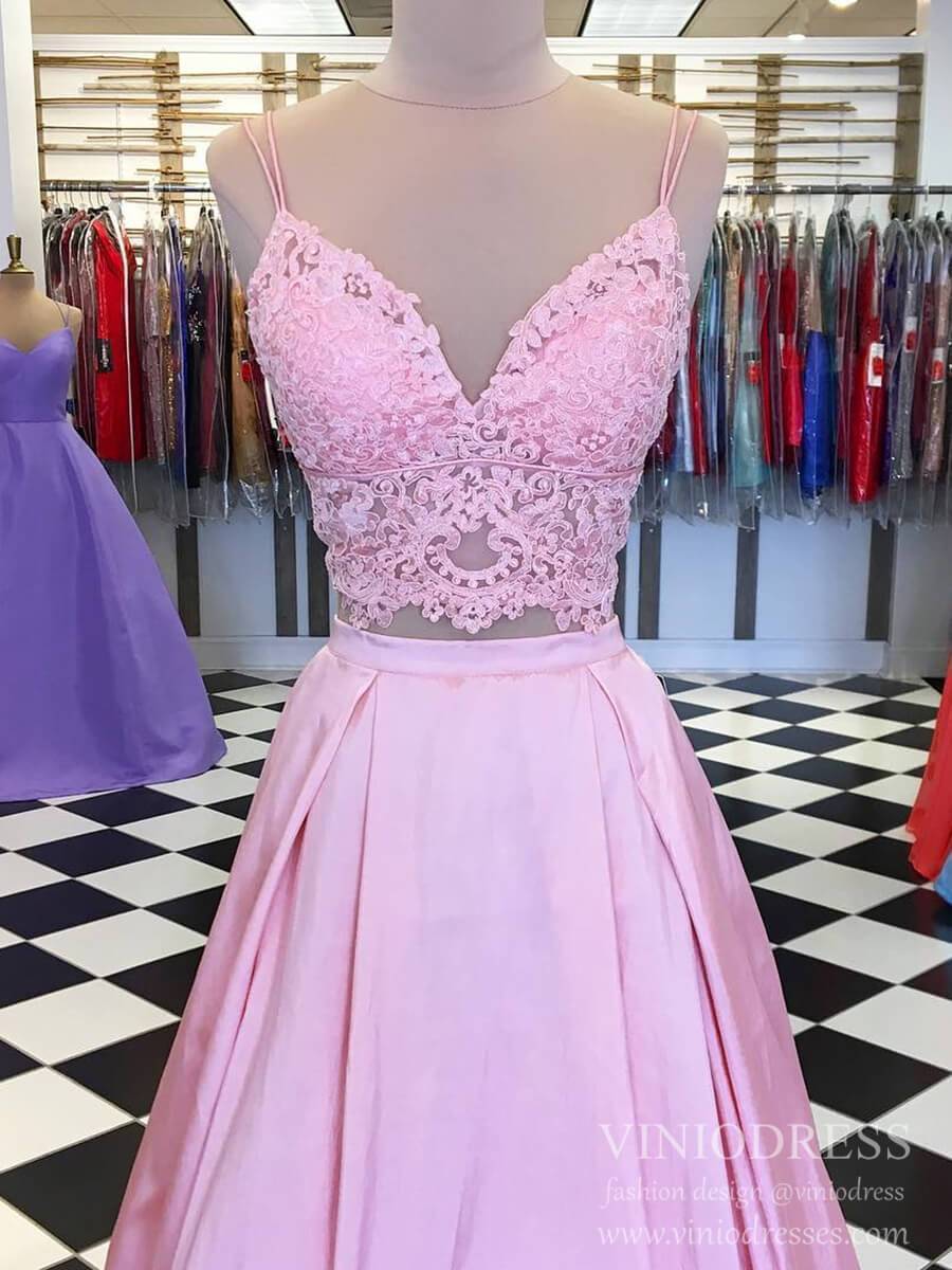 Spaghetti Strap Two Piece Pink Satin Prom Dresses Lace Bodice FD2125