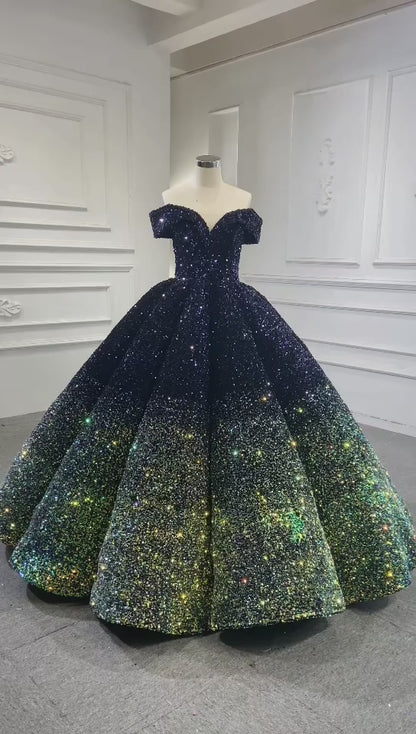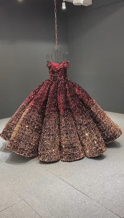 Make your quinceañera or Sweet 16 unforgettable in this dazzling Gradient Sequin Gown. Designed for a princess, this off-the-shoulder quinceañera dress features intricate sequin lace detailing that shimmers with every movement. The elegant corset back provides a perfect fit, enhancing your silhouette for a regal look. Whether for a quinceañera, debut, or formal event, this gown ensures you shine on your special day.