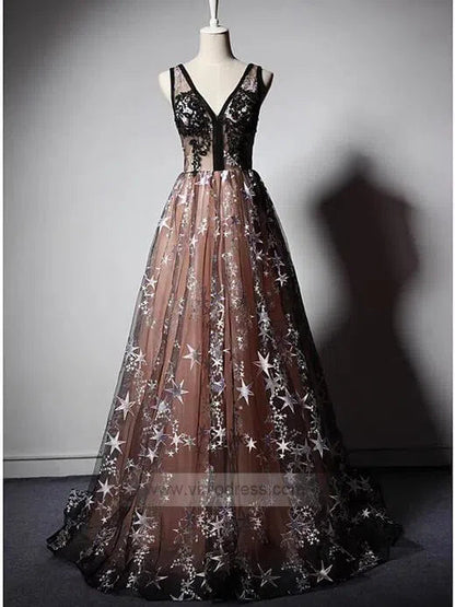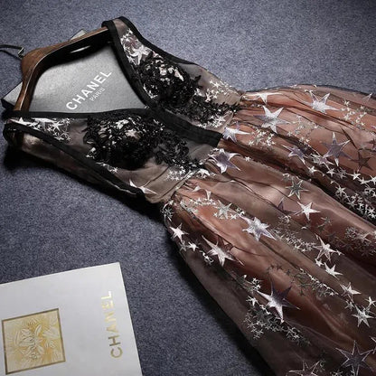 - Sheer corset bodice with lace embroidery - Padded cups with boning support - Spaghetti straps with lace-up back - Ruched satin skirt - High slit with lace trim - Floor-length with small train - Built-in bra and full lining