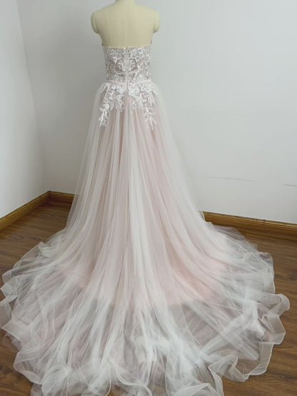 • Strapless beach wedding dress with delicate lace bodice of beadworks.