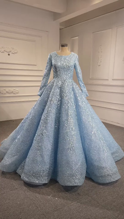 Light Blue Ball Gown Modest Long Sleeve Wedding Dress 66601 High Neck